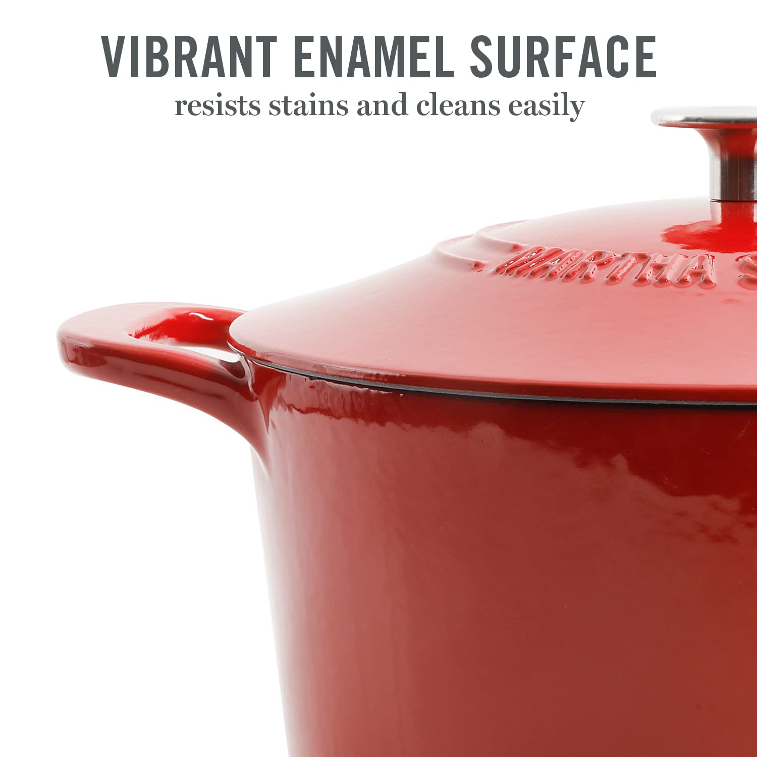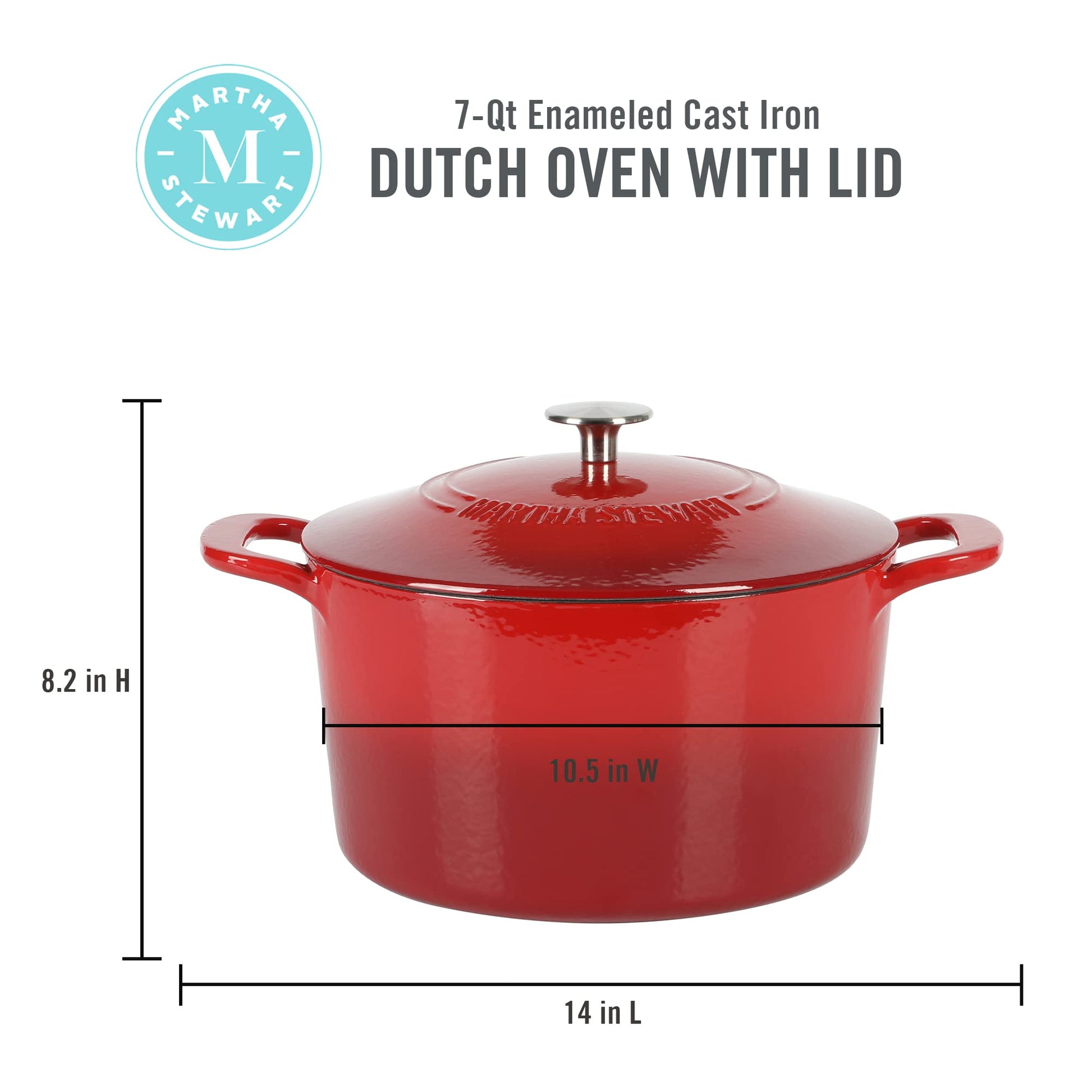 Details: The Martha Stewart Gatwick 7-quart Enameled Cast Iron Dutch Oven with Lid provides versatility and durability while making all kinds of delicious recipes every day. Crafted from durable cast iron, this piece distributes and retains heat evenly to slow cook stews, braise meats, bake casseroles, and more. The vibrant enamel finish resists stains for elegant presentation and easy cleanup. Sturdy handles offer balance and support when serving from oven to table. The lid has raised grooves to redirect moisture back on the food for tender, flavorful results. Safe in the oven (up to 500°F) and on all cooking surfaces, including induction stoves, this Dutch oven offers style and performance to inspire any home cook to explore and do more in the kitchen. Hand wash only.