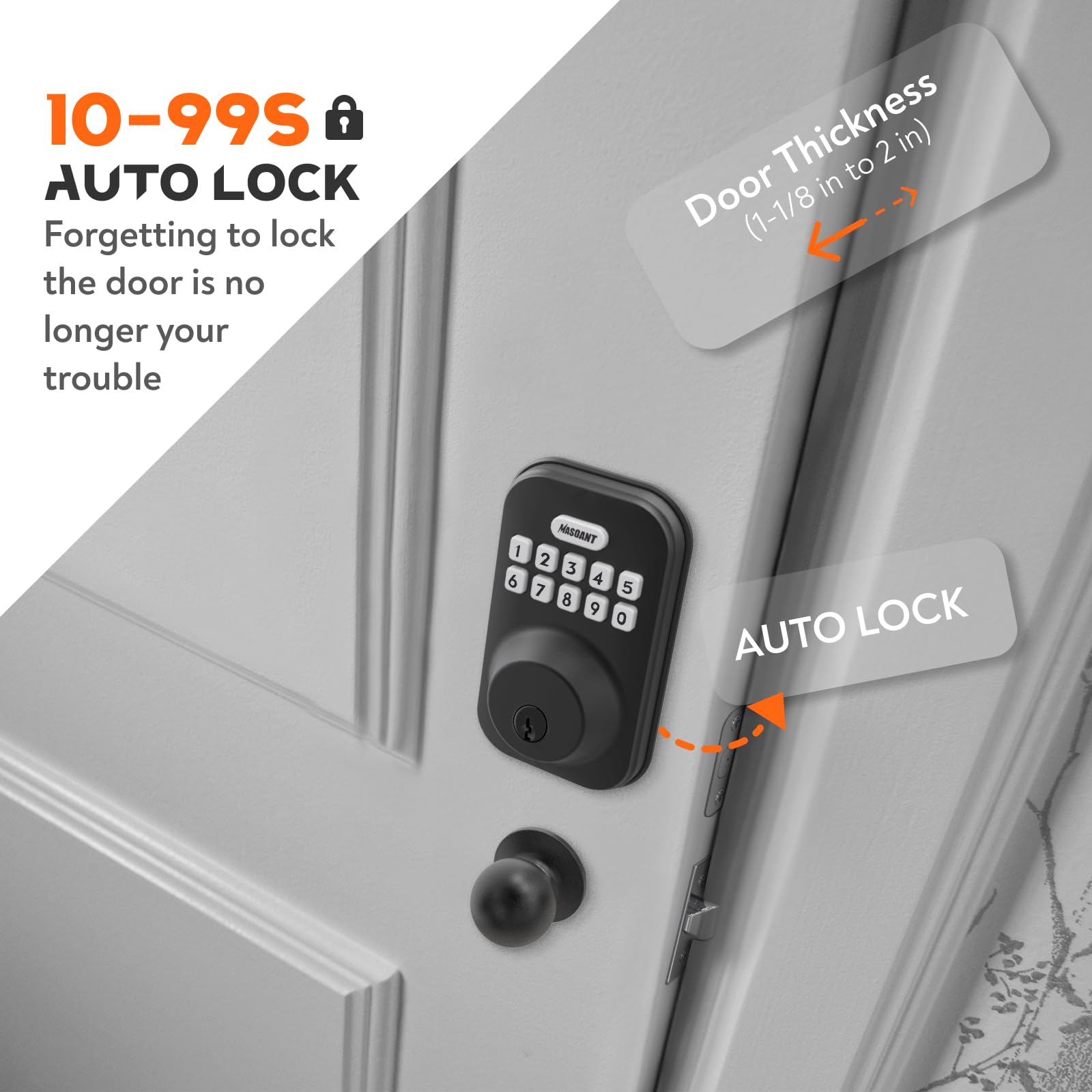 - 【Safe and Versatile】No longer need to remember to close the door, our digital door lock is able to lock automatically. Depending on your needs, you can set your lockout timer to any time between 10 and 99 seconds, or press and hold any keypad for more than 2 seconds to lock the deadbolt automatically. This superior lock has a vacation mode which is a great choice for travel, because it can restrict all user codes until master code is entered on keypad.