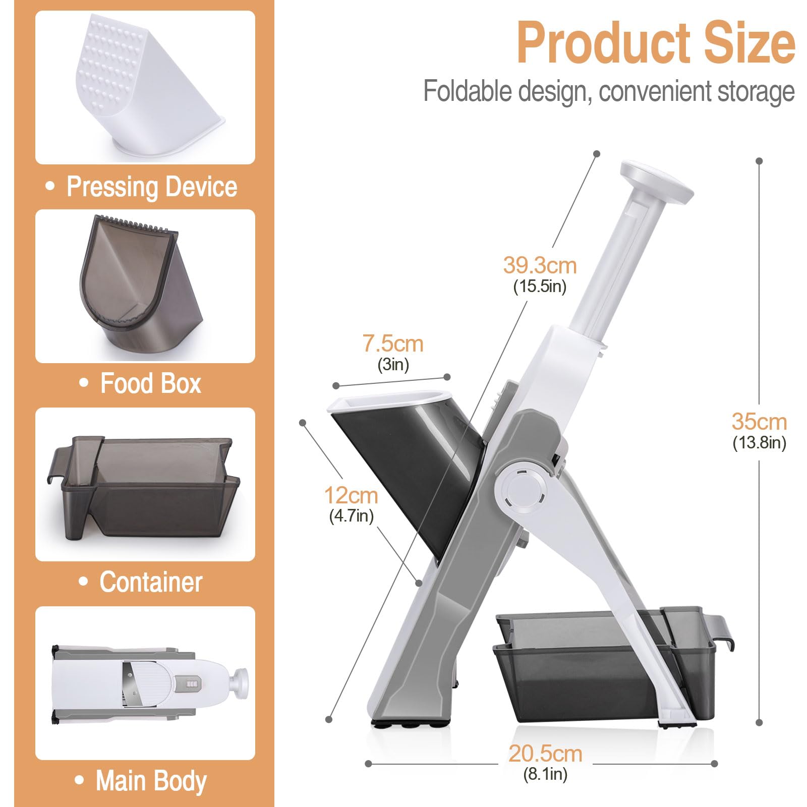 - EASY TO CLEAN AND STORE: The food chopper has a removable design, press the snap to easily remove the body of the slicer for cleaning. Simply rinse under the faucet after use. This food chopper is collapsible and can be easily stored after drying without taking up too much space.
