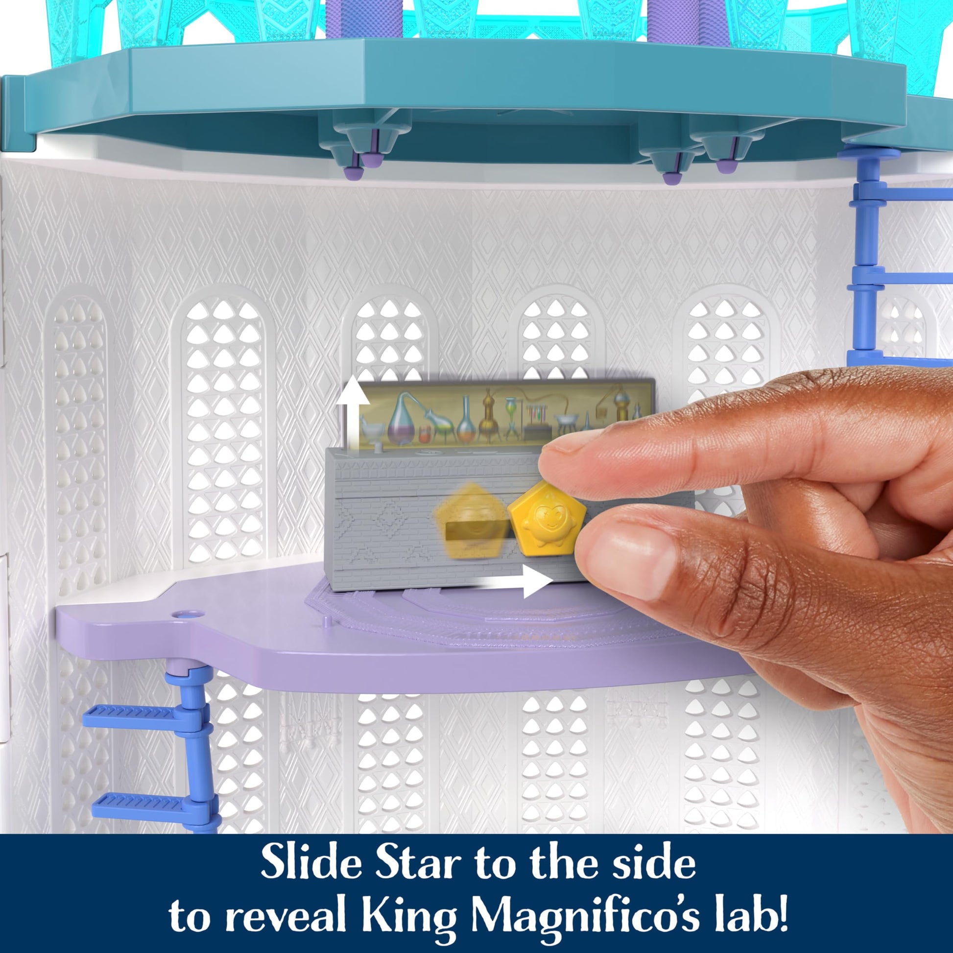 - Slide the Star Reveals button on the fireplace up and down to switch from fireplace to cooking pots, and the Star on the lab table to see the beakers move!