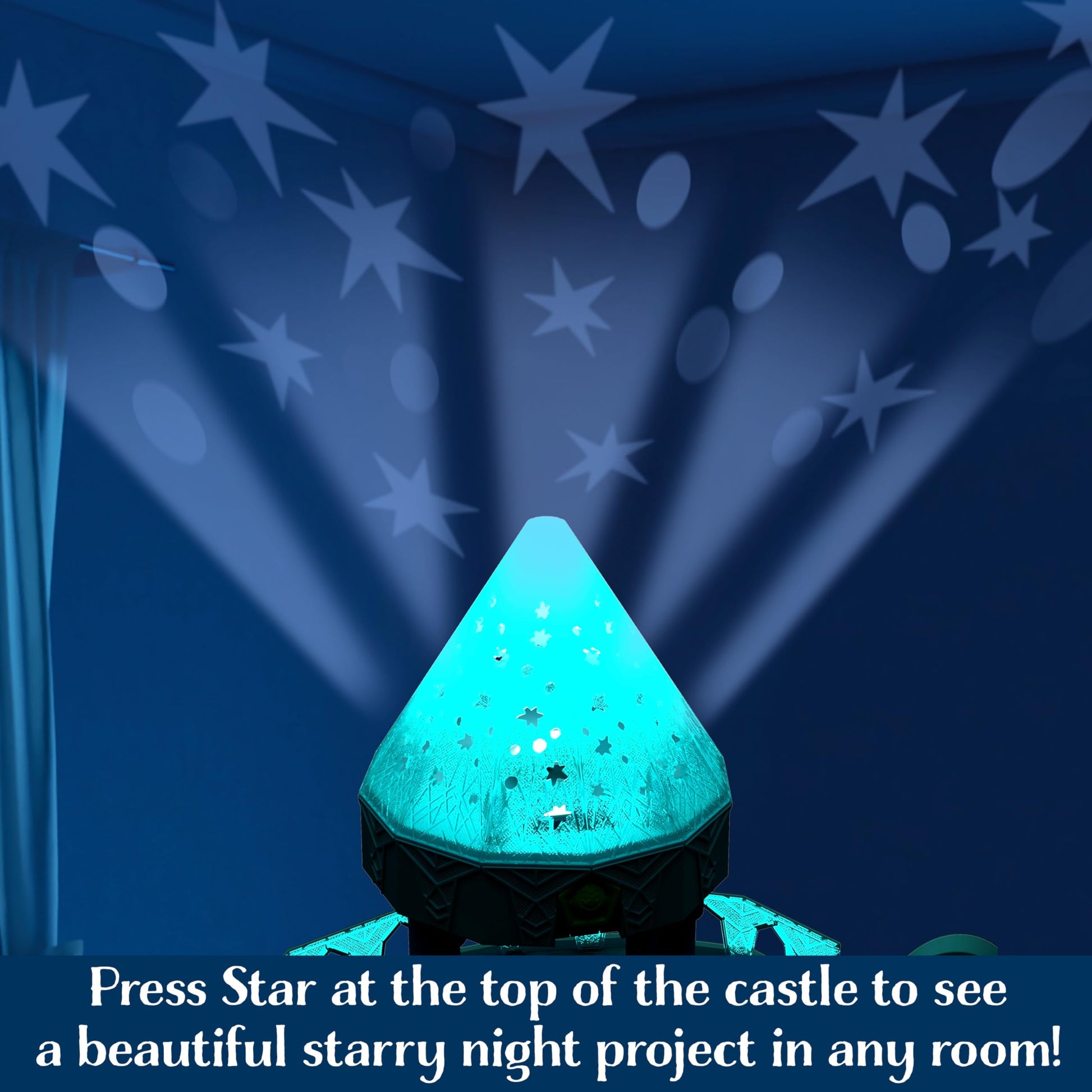 - The magic of the castle comes to life with the light-up dome -- press the Star Reveals button and watch a starry night sky appear with a light-up projection for 2 minutes; press again to dim!