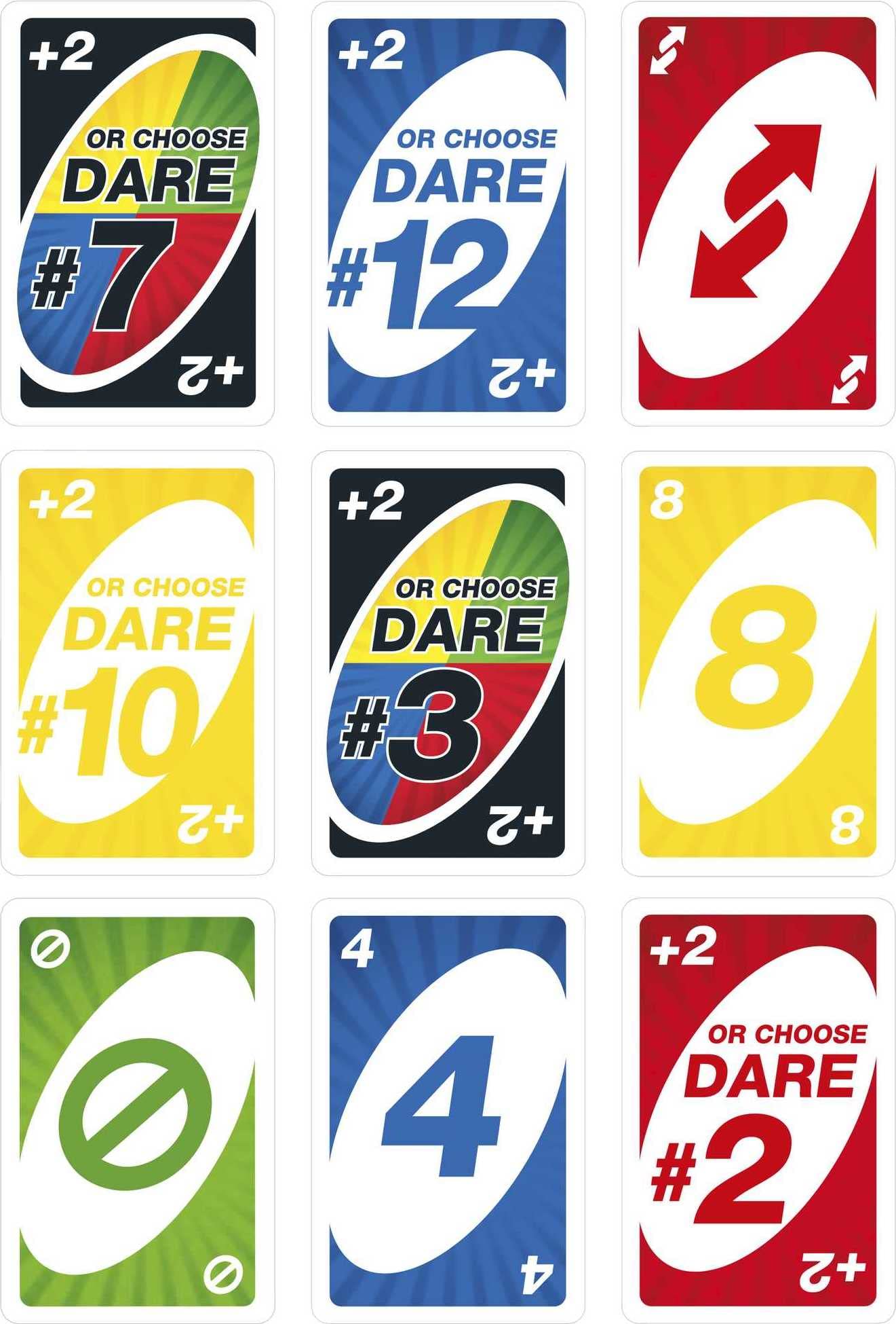 - UNO Dare! action cards force your opponent to either draw 2 cards or perform a hilarious dare! Talk like a pirate! Hold your cards with your feet! Dance like a robot and lots more!