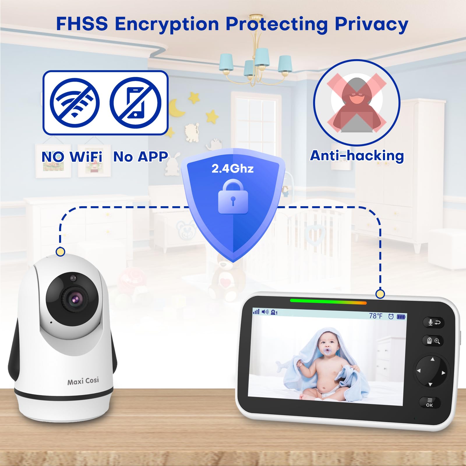 Maxi Cosi Baby Monitor with Camera and Audio, 5'' Sreen Baby Camera Monitor No WiFi,30-Hrs Battery, Pan-Tilt-Zoom Video Baby Monitors Portable,VOX, 2-Way Talk,Night Vision,8 Lullabies and 1000ft Range