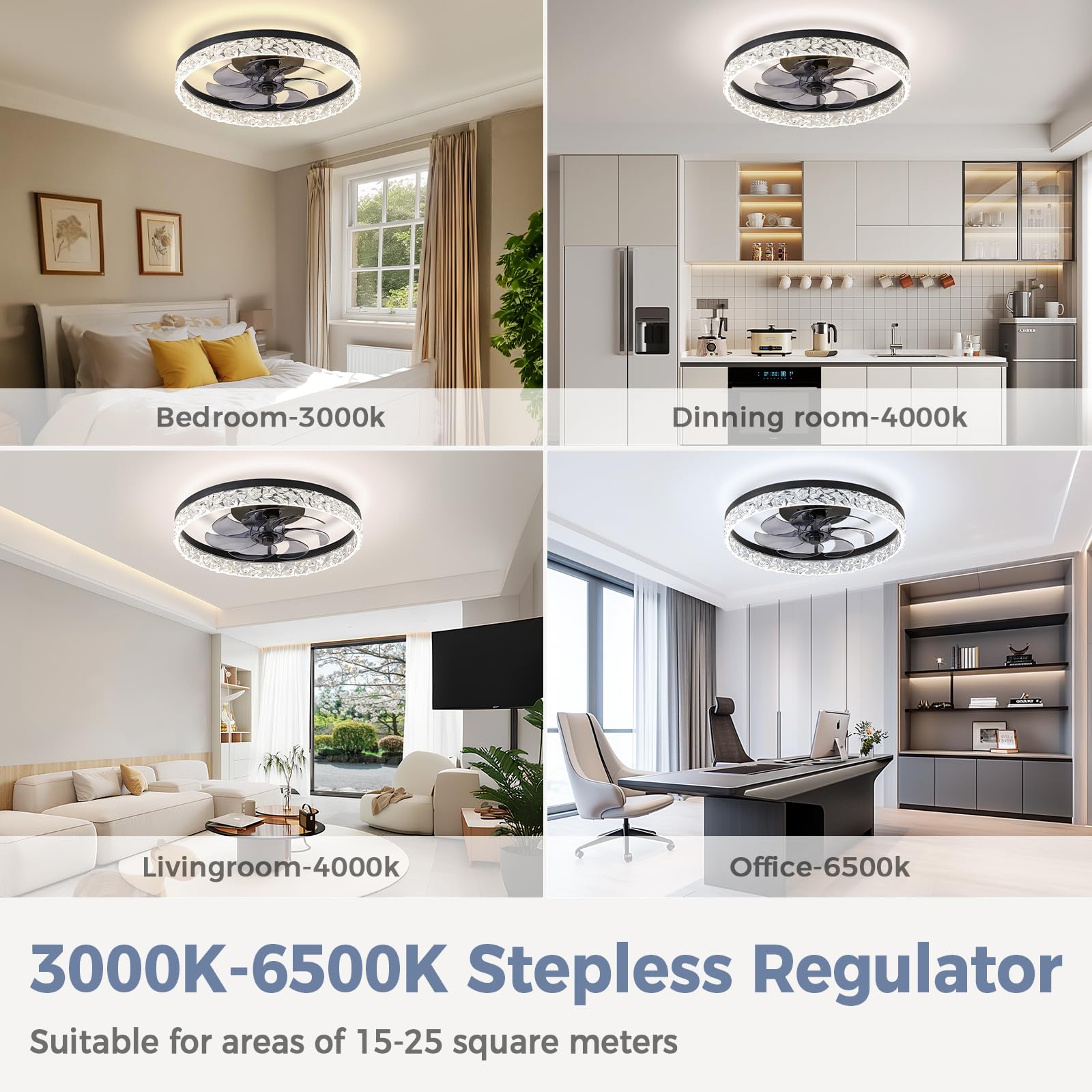 - Color Temperature Switch & Stepless Dimming--You can easily customize the brightness from 10% to 100% and choose the color temperature from warm (3000 K) to white (6500 K) through the remote control or APP. Whether you require bright, cool lighting to illuminate your workspace or warm, cozy lighting to relax, the ceiling fans with lights and remote provides a variety of options to create your desired atmosphere. Meanwhile, the memory function allows you to save the functions you just set