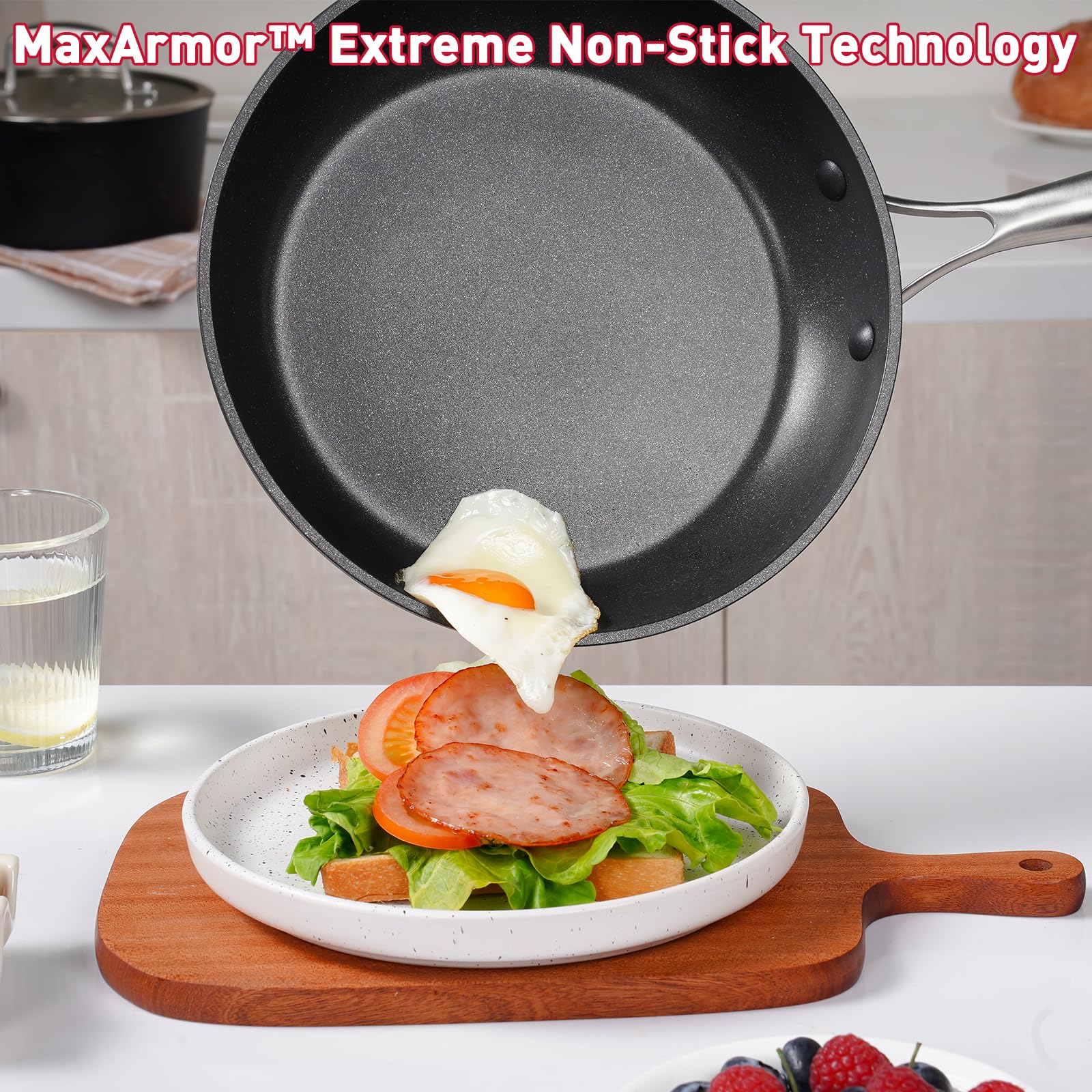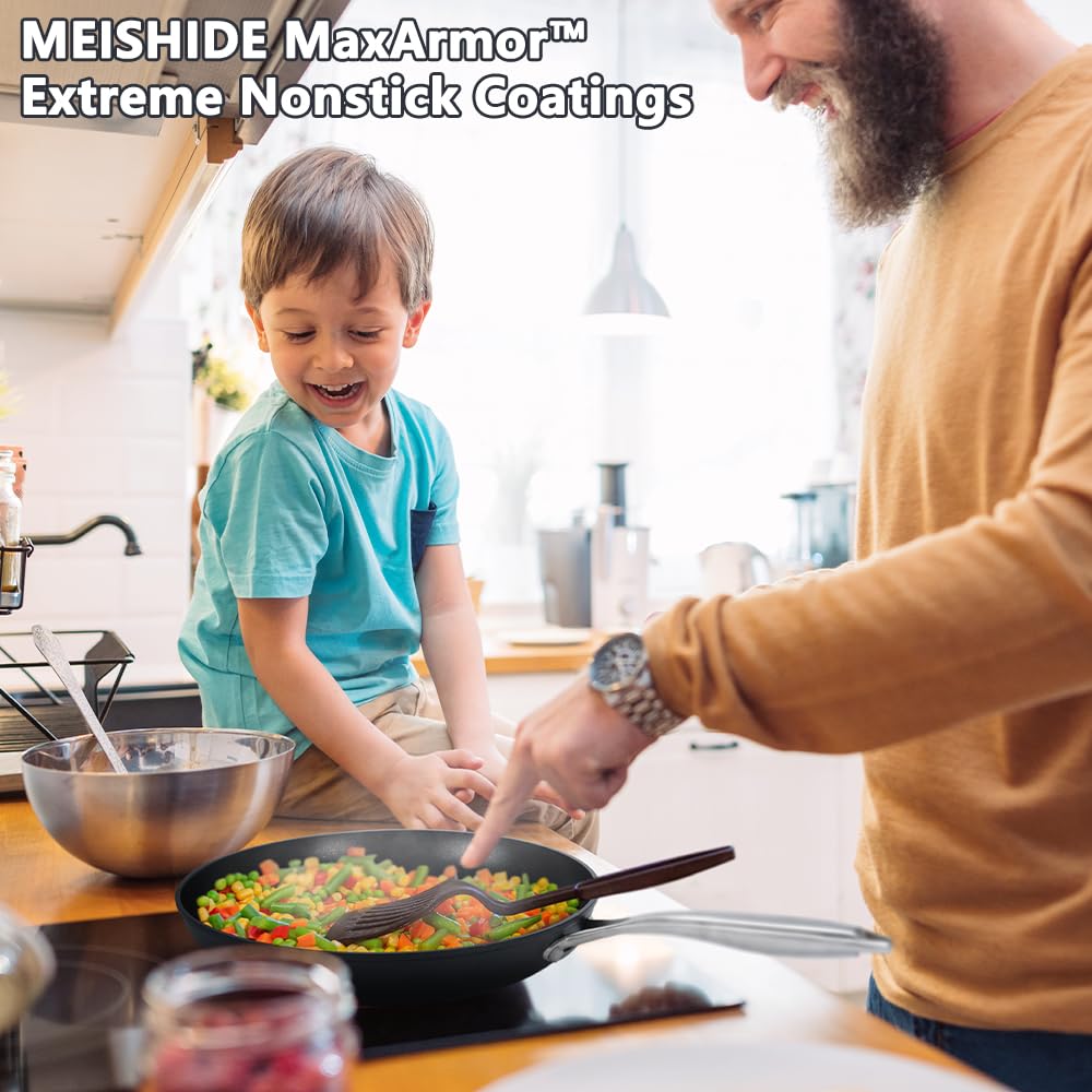 - 【Unbeatable Non-Stick Performance with MaxArmor Coating】Say goodbye to stuck food and tedious cleaning! The MEISHIDE 12" Frying Pan features MaxArmor non-stick coating that outperforms traditional coatings, making cooking and cleanup effortless. It ensures food slides off easily—whether you’re cooking eggs, pancakes, or stir-fry. No more scratching, chipping, or peeling!