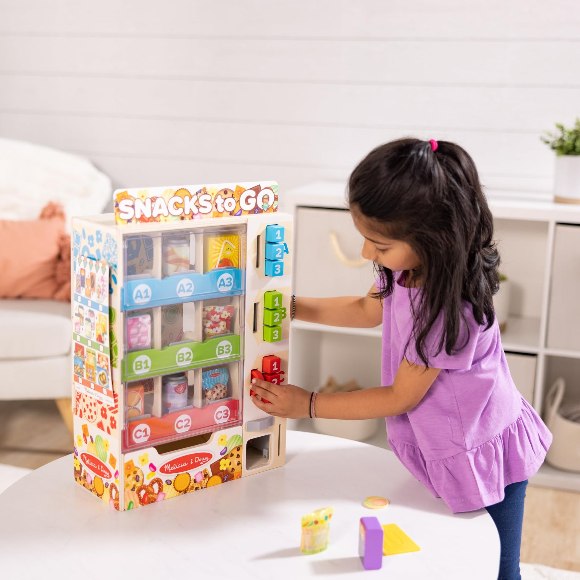 Details: Satisfy hungry imaginations with the push of a button! Open up the back of the unique wooden vending machine and stock it with nine double-sided play food packages, including snack bars, drinks, and pouches. On the front, select an item, insert a color-matching play coin or bank card, press the corresponding letter and number button, and the snack drops into the collection drawer! No batteries required! There’s a sign that can be personalized and a reusable activity card for keeping track of what to stock and what to display. The vending machine measures 17 inches high x 12.5 inches wide x 5.5 inches deep, and requires no assembly. This vending play set is an engaging, hands-on way to help teach kids about cause-and-effect, and to encourage letter, number, and color recognition, sorting, matching, counting, and fine motor skills. All the pieces store in the vending machine for easy cleanup.
