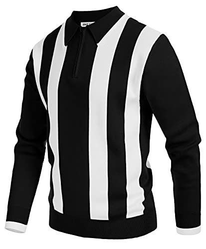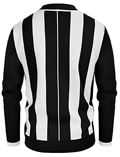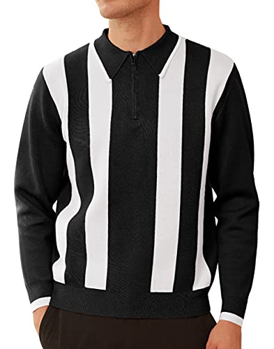 Men's Quarter Zip Polo Knitted Pullover Sweater Casual Contrast Striped Lapel Collar Long Sleeve Sweater Tops Black M