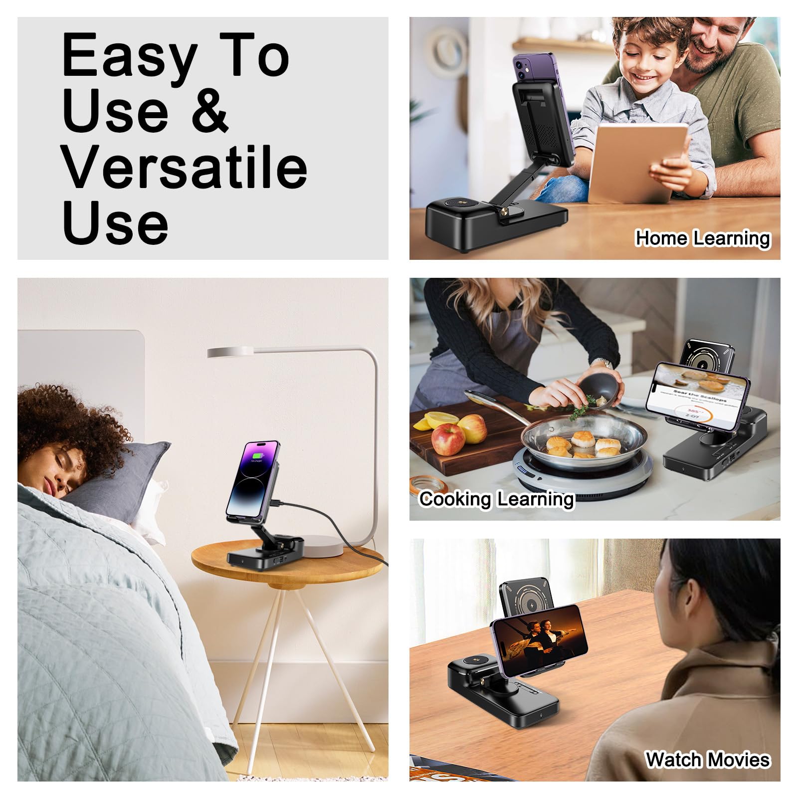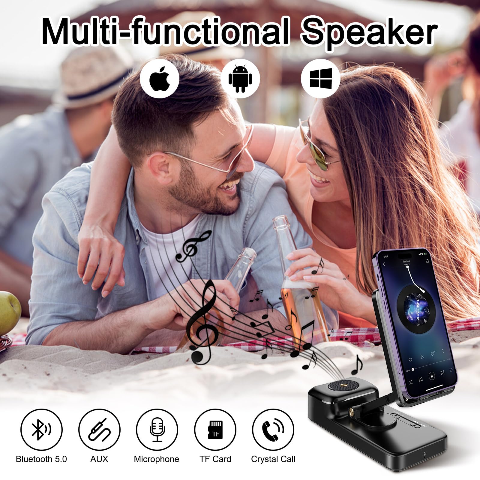 - 4-IN-1 CELL PHONE STAND WITH BLUETOOTH SPEAKER & WIRELESS CHARGING: This versatile device combines a wireless Bluetooth speaker, wireless charging, phone holder, and a built-in microphone. It offers hands-free convenience for video watching and phone calls, along with wireless charging capability while you watch. The upgraded Bluetooth speaker also features a USB output for emergency charging, catering to phones that do not support wireless charging.