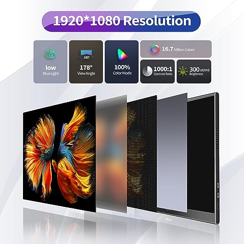 - 【1080P Full FHD Portable Monitor】Designed with advanced 15.6 inch IPS screen and a wide 178° viewing angle, this portable monitor for laptop offers immersive viewing. With a resolution of 1920x1080 and HDR technology,the portable laptop monitor delivers incredible clarity and vibrant colors that enhance your gaming and multimedia experience.