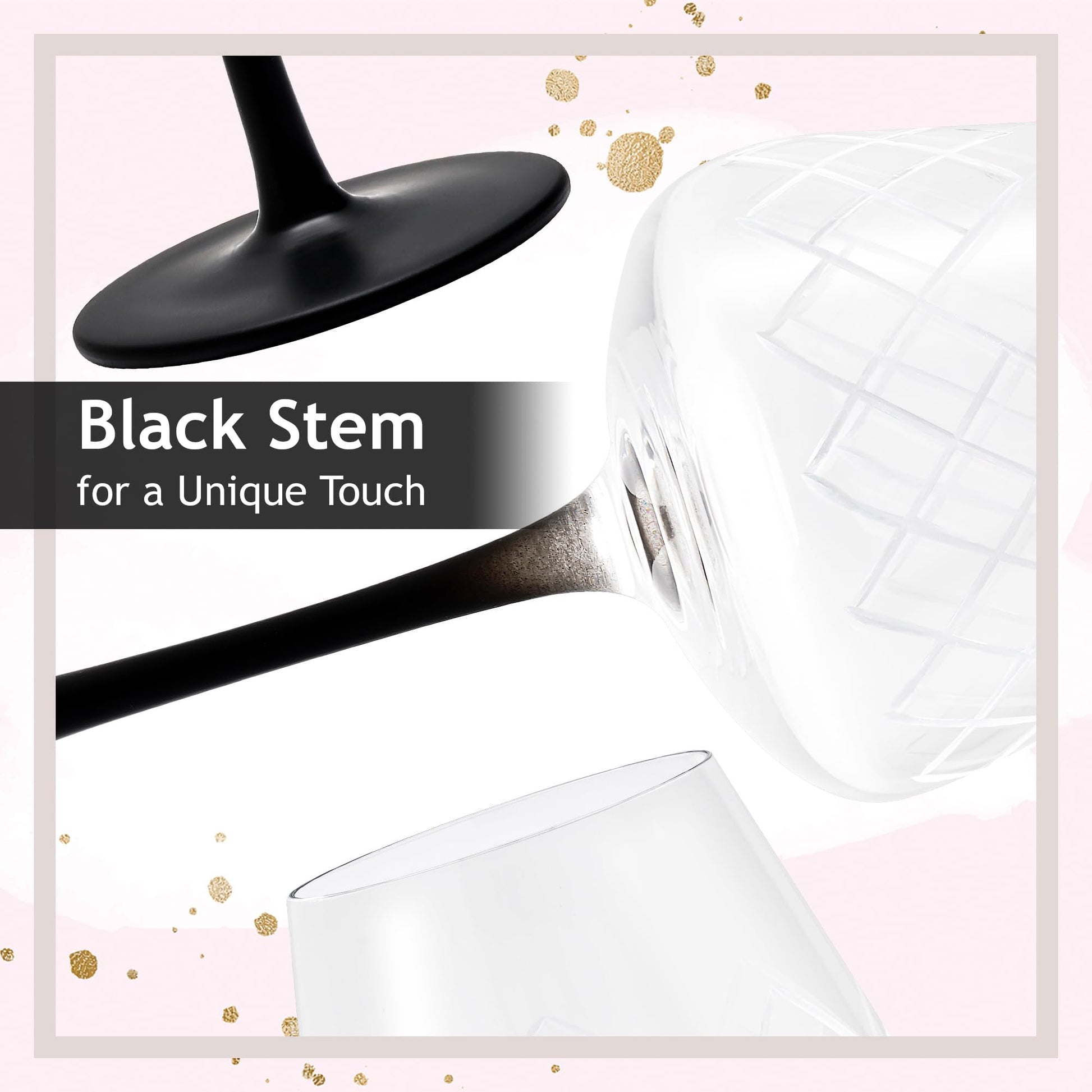 - ππππππ ππππππ - Meticulously crafted with elegance in mind, this set of four elegant and cute wine glasses showcases a crystal carved design with a black stem. These crystal glasses are guaranteed to make a lasting impression on anyone who beholds them.