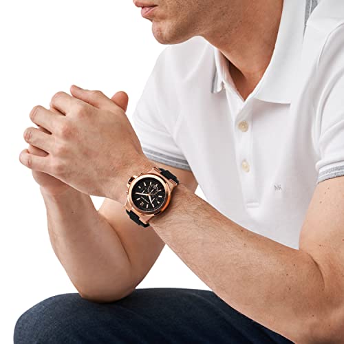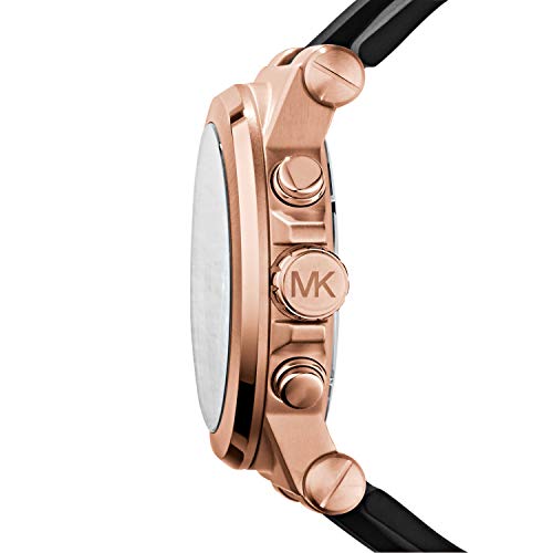 Details: Watch Sizing Guide Embellish your style with this wonderfully eye-catching Michael Kors™ timepiece. Rose gold-tone stainless steel case. Adjustable polyurethane strap with buckle closure. Luminous three-hand analog display with quartz movement, three sub-dials and date display window. Chronograph functionality. Dial face includes hour markers and minute track at dial perimeter. Dial ring features military time. Water resistant 10 ATM/100 meters. Measurements: Case Height: 48 mm Case Width: 48 mm Case Depth: 13 mm Band Width: 25 2⁄5 mm Band Circumference/Length: 10 in Weight: 5 oz