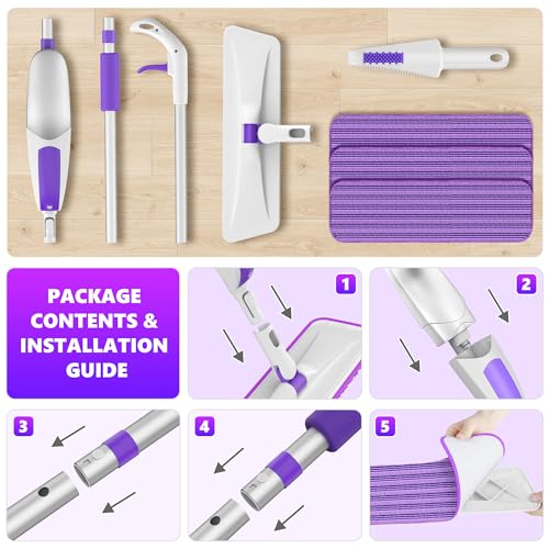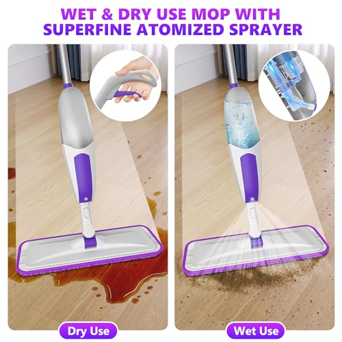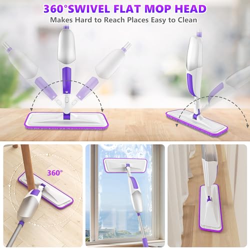 - [MULTIPURPOSE MOP FOR MULTI-SCENE]: whether used as a bathroom mop, kitchen mop or dust mop, this mop for floors is very suitable. Combined with the mop pads and a multi-function scraper, the spray mop for laminate floors can easily remove most dirt, such as dust, hair, animal hair, solid debris, oil and other stubborn stains, and it is safe to use on all floor types including wood, hardwood, laminate, tile, ceramic, vinyl, marble, glass, stone, cement floors etc.