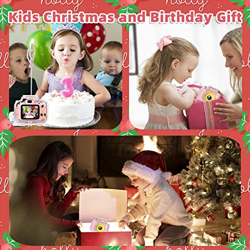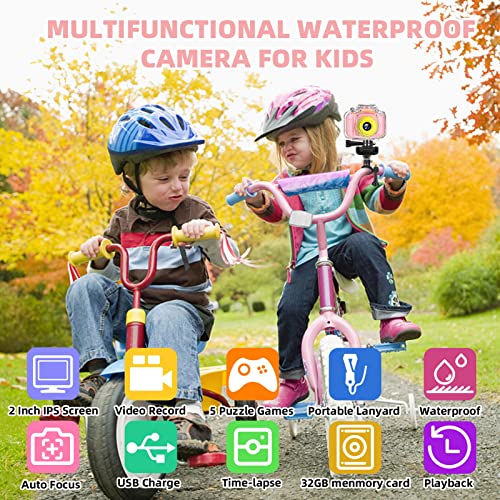 Miiulodi Kids Waterproof Camera - Birthday Gifts for 3 4 5 6 7 8 9 10 Year Old Girls 2 Inch IPS Screen Underwater Action Camera with 32 GB SD Card, Pool Toys for Kids Age 8-12 Pink