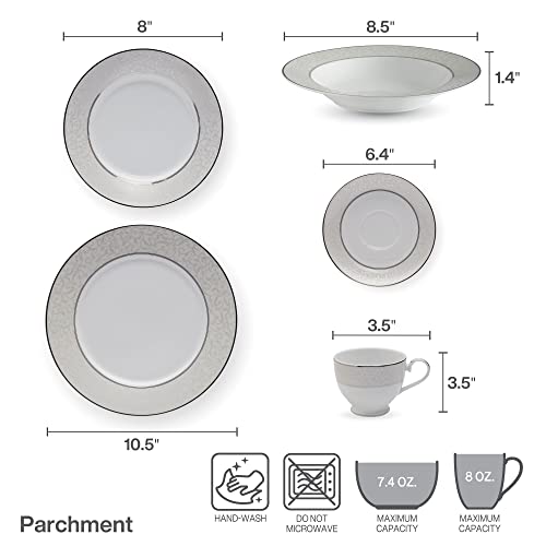 Details: Parchment dinnerware collection features a gentle gray border embellished with a beautifully detailed scroll design. This chic and elegant Collection is accented by inner and outer borders of Platinum. Crafted of porcelain. Dishwasher safe but not microwave safe. When washing gold or platinum banded dinnerware in the dishwasher, use a gentle cycle and turn off the dishwasher before the drying cycle, or allow the dinnerware to cool before handling it. The high temperature of the heated drying cycle can cause the precious metal bands to soften. This 40 piece set includes (8) each: 10-3/4 inch dinner plate, 8-1/2 inch salad plate, 8-1/2 inch soup bowl (12 ounce), 9 Ounce tea cup and 6-1/2 inch tea saucer.