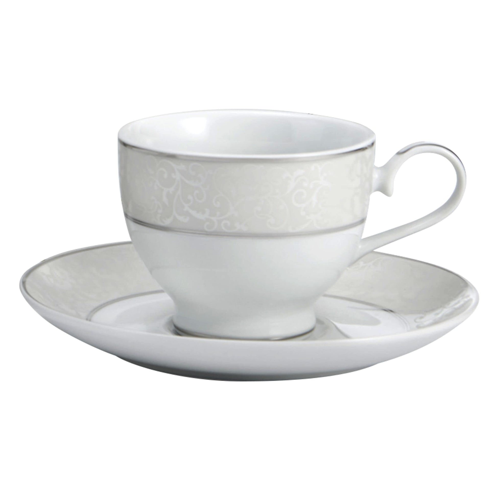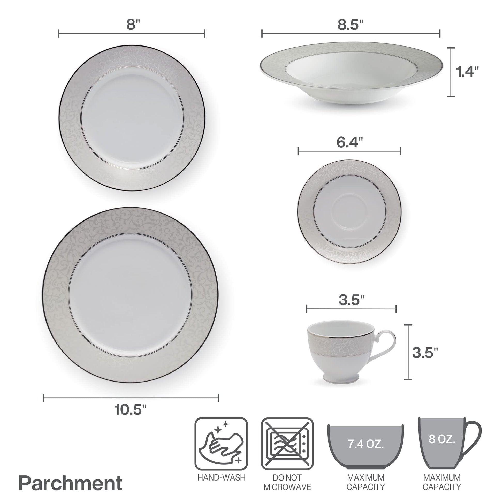 Details: Parchment dinnerware collection features a gentle gray border embellished with a beautifully detailed scroll design. This chic and elegant Collection is accented by inner and outer borders of Platinum. Crafted of porcelain. Dishwasher safe but not microwave safe. When washing gold or platinum banded dinnerware in the dishwasher, use a gentle cycle and turn off the dishwasher before the drying cycle, or allow the dinnerware to cool before handling it. The high temperature of the heated drying cycle can cause the precious metal bands to soften. This 40 piece set includes (8) each: 10-3/4 inch dinner plate, 8-1/2 inch salad plate, 8-1/2 inch soup bowl (12 ounce), 9 Ounce tea cup and 6-1/2 inch tea saucer.