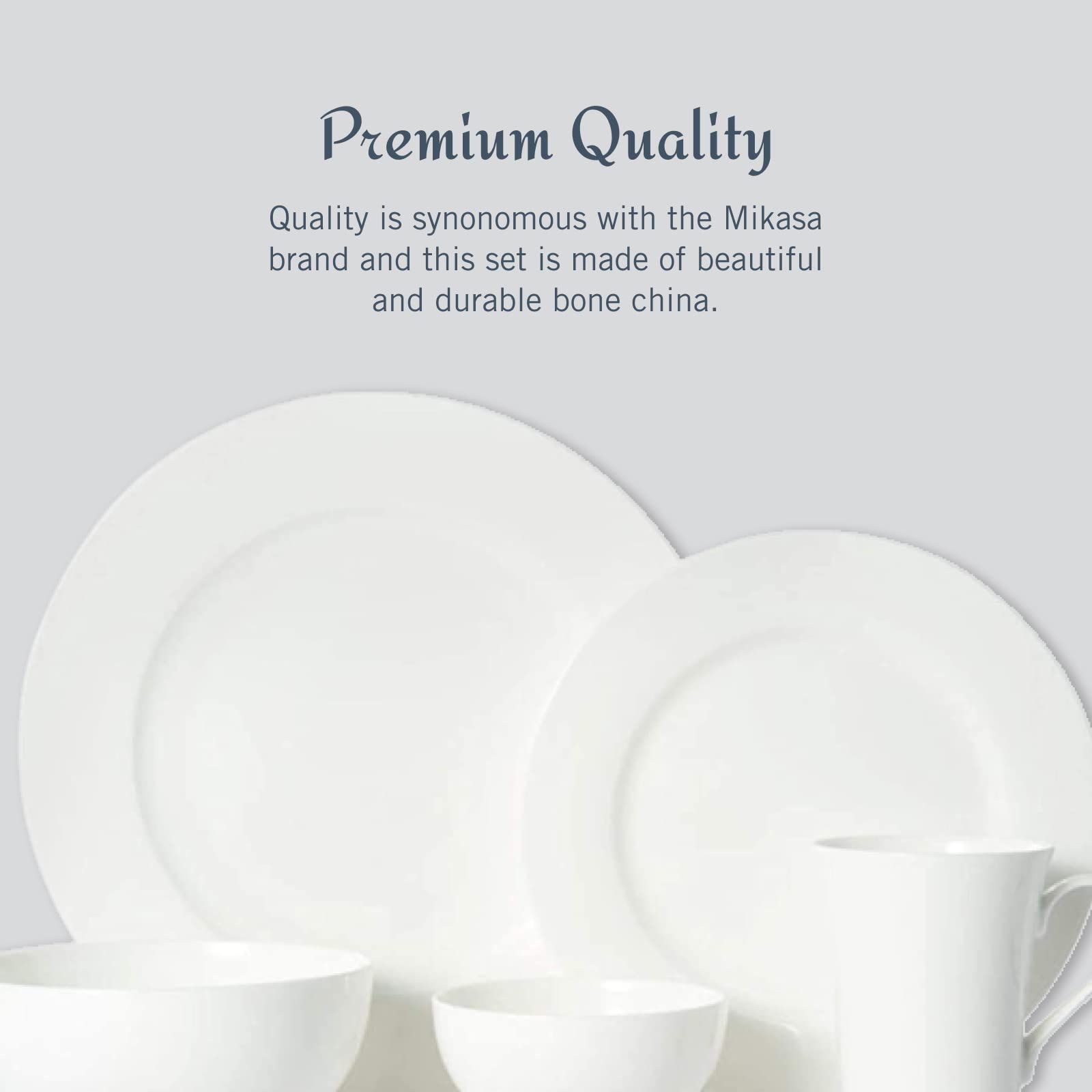 Details: Mikasa Delray dinnerware brings sophistication to any table using minimalist style, clean lines, and smooth, pure white surfaces. Made of high quality bone china, this collection is casual and stylish and great for everyday use. This simple dinnerware set is chip resistant, microwave, dishwasher, freezer and oven safe. 40- piece dinnerware set, service for eight, includes (8) each: 11 inch dinner plate, 9 inch salad plate, 6 inch diameter (24 ounce) cereal bowl, 4-1/4 inch diameter (8 ounce) fruit bowl and 14 ounce mug.