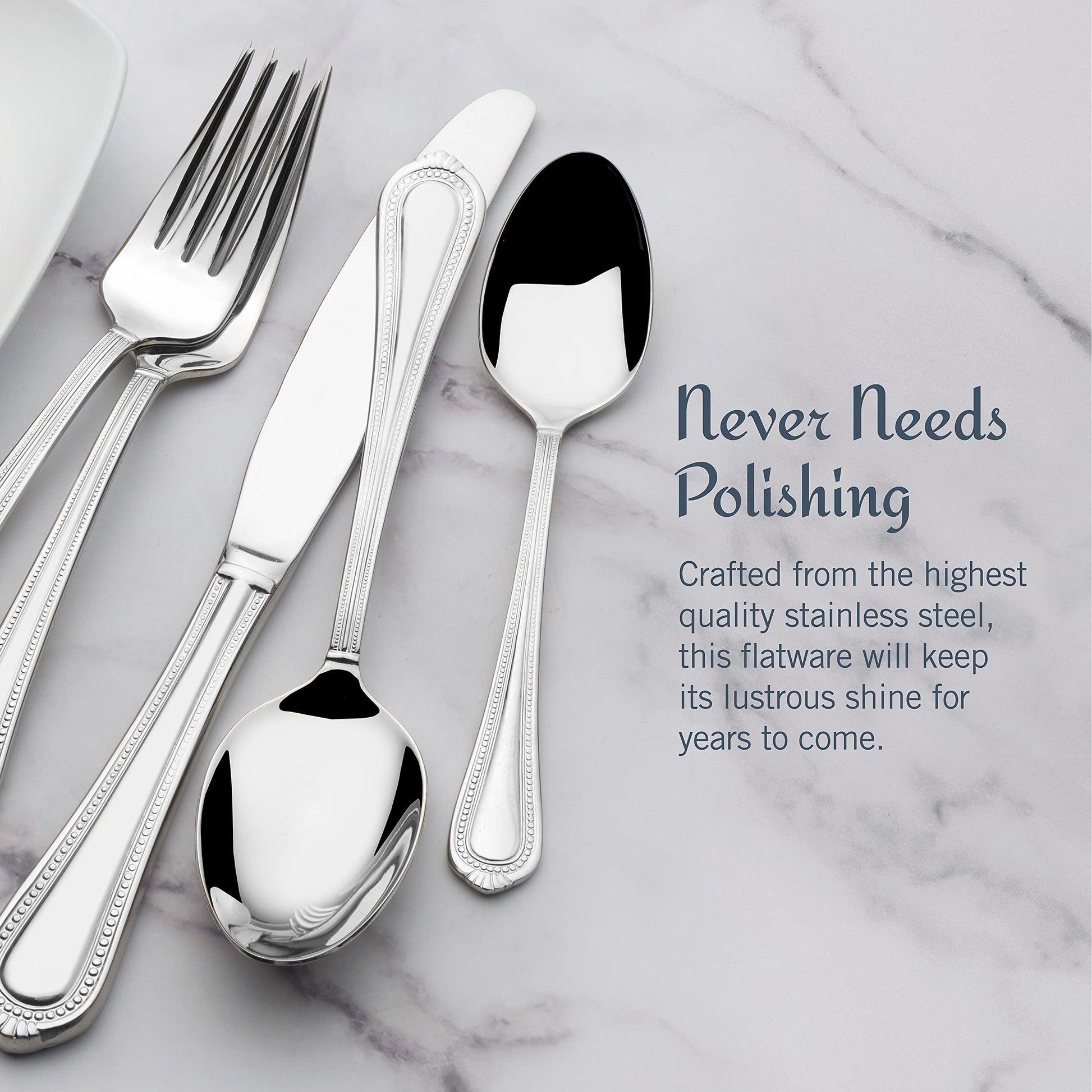 Details: Bring a touch of stately grace to your formal gatherings with this Regent Bead 65-Piece Flatware Set by Mikasa. Beautifully crafted of 18/10 stainless steel, this elegant set features classic teardrop handles embellished with a beaded border and a flourishing accent at the tip, for a look that is regal and sophisticated. 65-piece set, service for 12, includes 12 each of: dinner fork, salad fork, dinner knife, dinner spoon, and teaspoon, plus a hostess set including 1 each of serving tablespoon, pierced tablespoon, cold meat fork, butter knife, and sugar spoon. Dishwasher safe.
