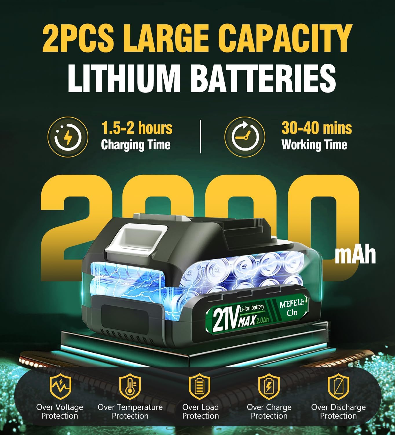 - 【RECHARGEABLE LITHIUM BATTERY】Equipped with two high-capacity 21V 2000mAh rechargeable lithium batteries, enjoy extended run times and quick charging convenience. Stay prepared for any task with minimal downtime between uses. The battery-powered design ensures you can work efficiently without being tethered to a power outlet.