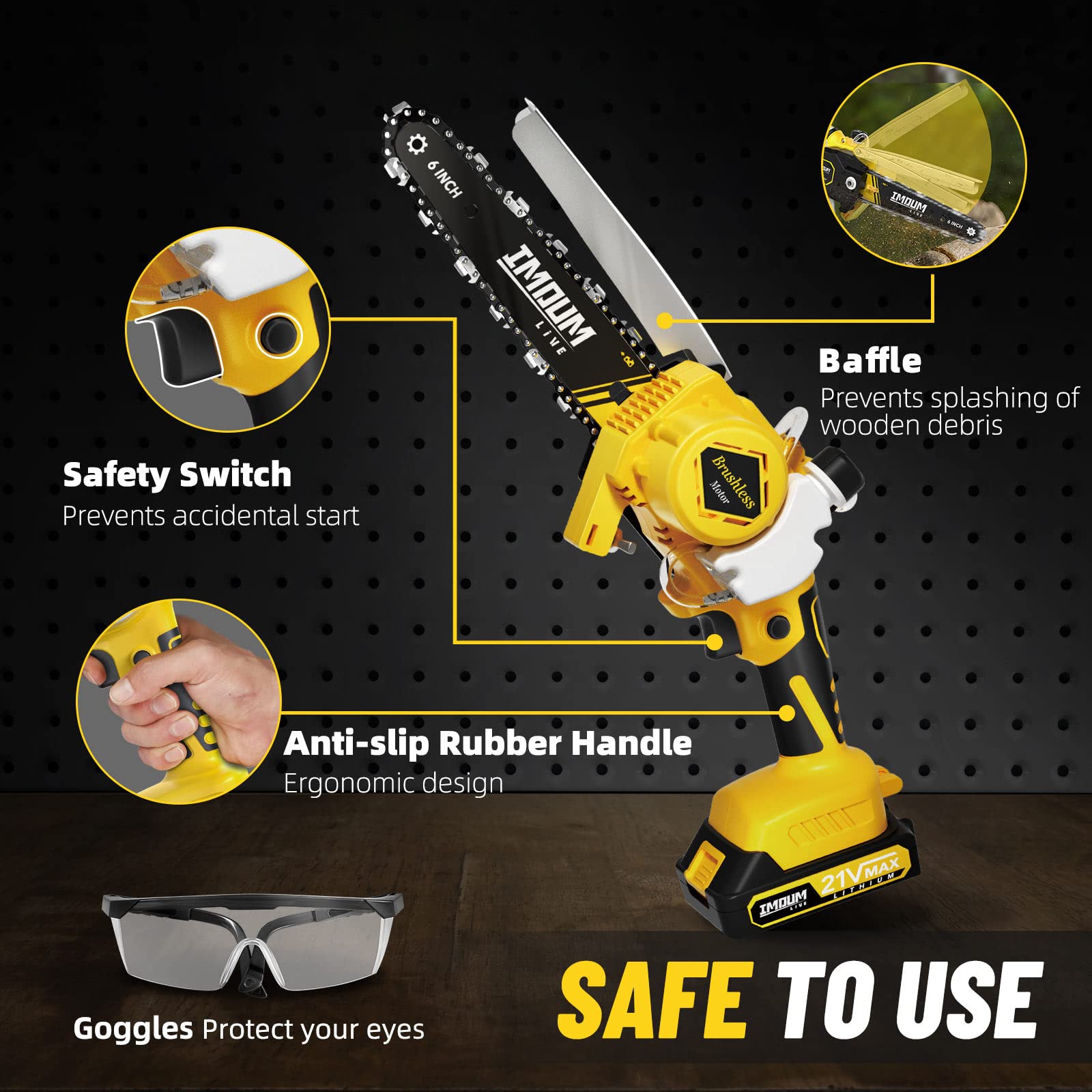 Details: Designed with top-professional mechanics, using the high-quality brushless motor as the core, this mini chainsaw provides longer life, stronger output and optimal energy-saving - no matter what the job entails. With innovative high-torque technology, the IMOUMLIVE's mini chainsaw is fundamentally different from other carbon brush motor products; ensuring ease of use and top quality results everytime!