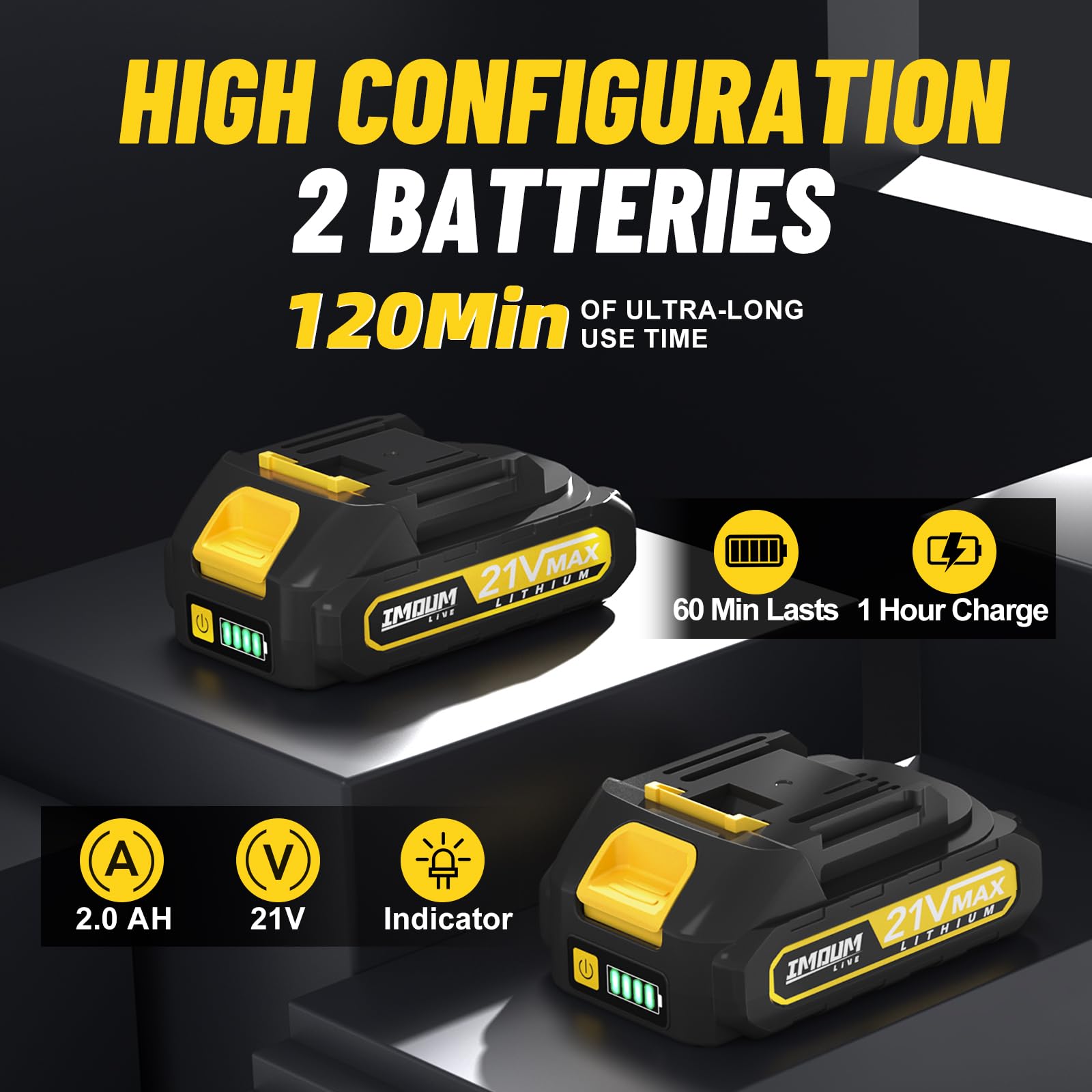 - 2×21V 2.0Ah Batteries. Besides the installed battery, the electric saw is also equipped with an extra battery. Each can last 50-60 minutes. The alternating 2 batteries provide continuous power for outdoor work (Compatible with Makita Battery)
