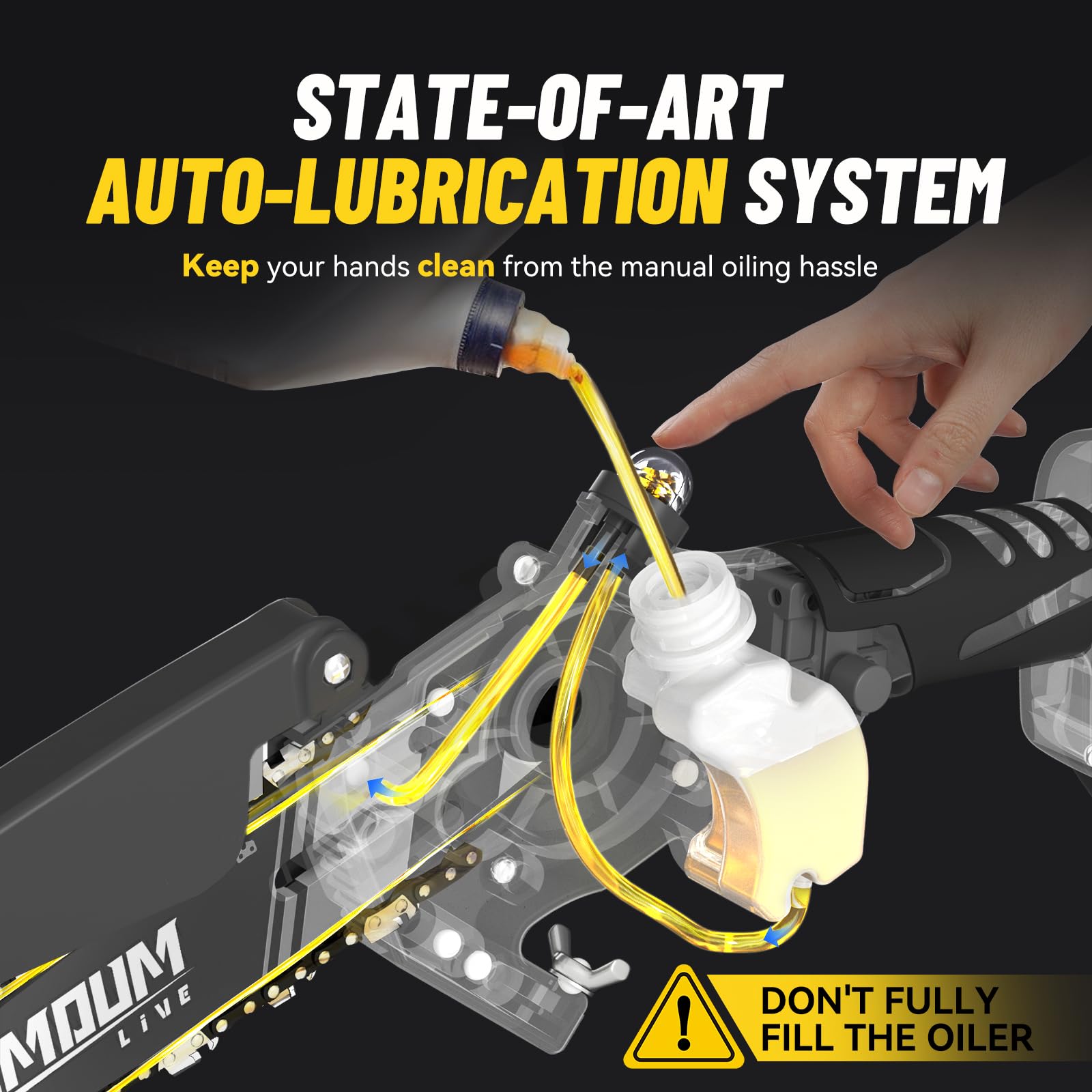 - Auto-Oiling System. The mini chainsaw has a built-in lubricating oiler that keeps the tool cutting efficiently with just one push. This innovation will eliminate the hassle of manual oiling and keep your hands free from staining (The upgraded product has solved the oil leaking problem)