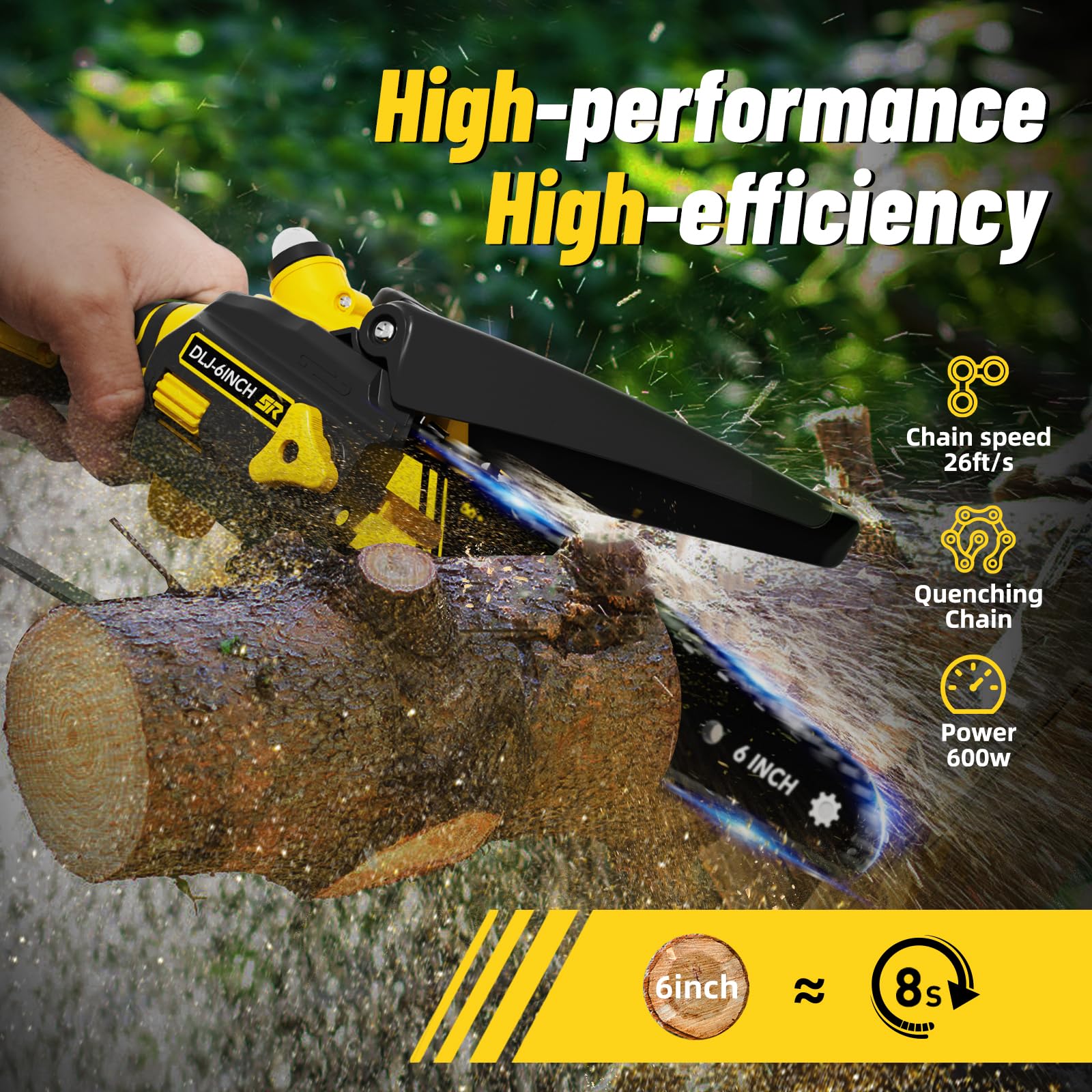 - Smooth and Powerful Cutting. With the high cutting speed of 26.2ft/s, our mini chainsaw only takes about 8s to cut a 6'' log. Cutting branches is just like cutting butter! Also, the brushless motor allows the electric chainsaw for continuous cutting