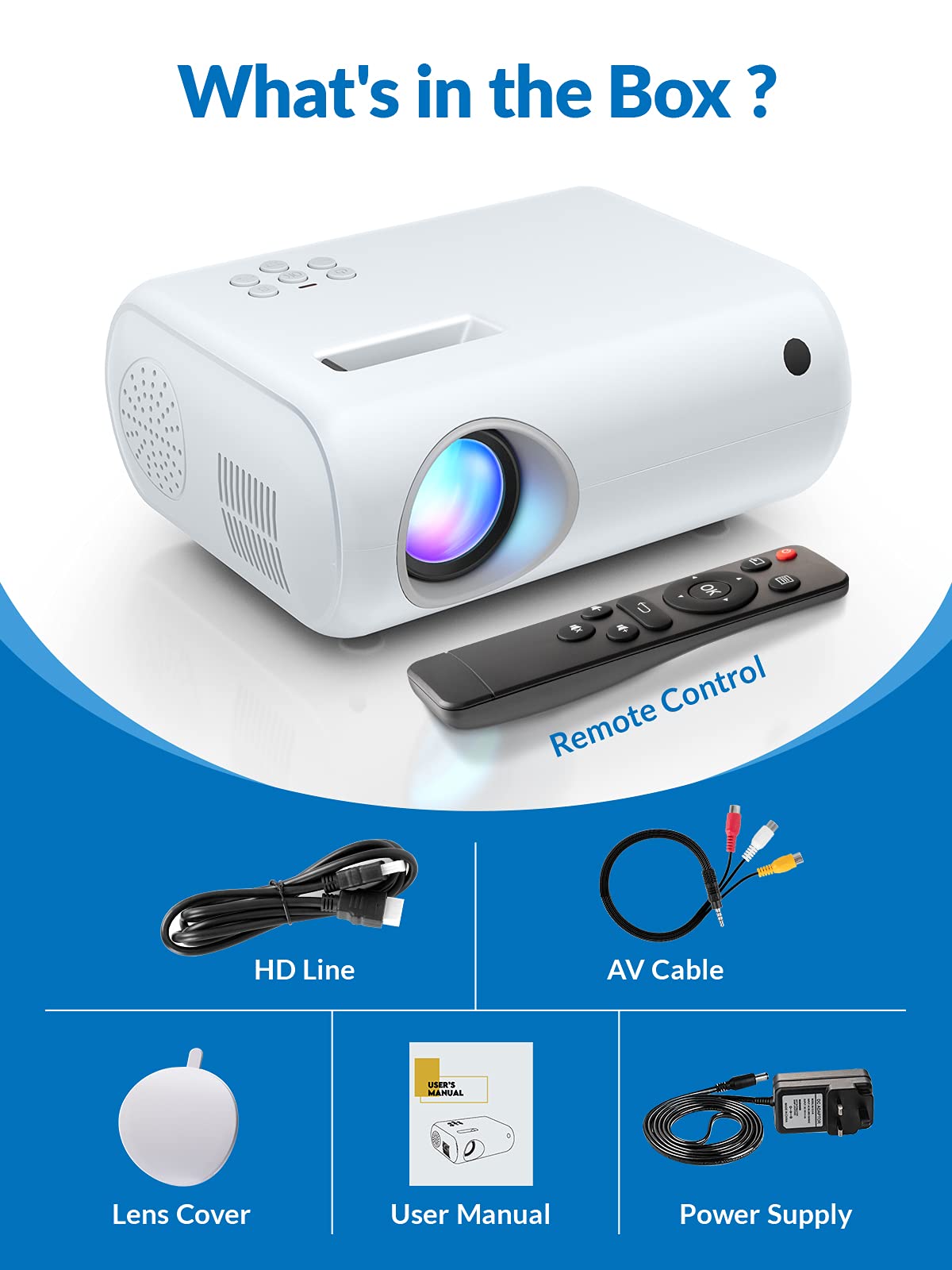 - 【Mini & Portable Projector】 This mini projector has a unique and elegant design with a size of 6.74x5.28x2.96 inches and a weight of 0.72 kg. It is small enough to fit in your bag. Moreover, there is a handle on the product box for carrying. Therefore, it is rather light and handy to carry when you go out.