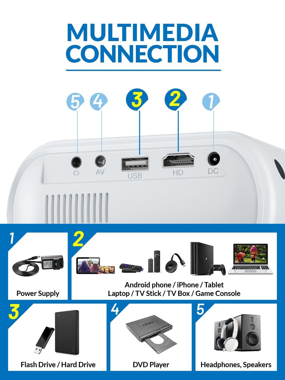 - 【Multiple Devices Connection & Wide Application】 Equipped with HDMI, USB, and AV interfaces, the movie projector works perfectly with iPhone/Android Phone, Tablet/iPad, Laptop, Macbook, Blu-ray Player, TV boxes, DVD players, PS4, USB flash disks, etc. It can be applied to home theaters, video games, parties, and outdoor activities. ☛( Note: Due to HDCP copyright, this projector doesn't support Netflix, Amazon Prime, and Hulu, but you could use Amazon Fire Stick or Roku Stick.)