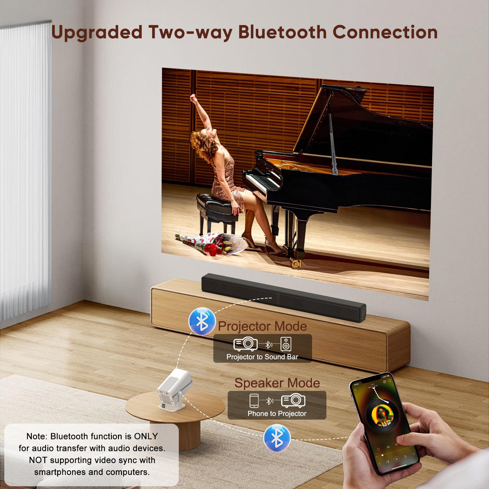- 【Integrated Stereo Speaker & Upgraded Two-way Bluetooth】The Bluetooth projector with built-in 3w speakers, delivers crystal clear and loud enough sound, perfect for small bedrooms or cozy movie nights. For an even richer experience, Bluetooth capability allow you to effortlessly pair with external speakers, soundbars or headphones. Perfect for amplifying outdoor movie nights, backyard parties, or private viewing sessions; You can also use the projector as a standalone speaker via Bluetooth connection with your phone (only for audio transfer)