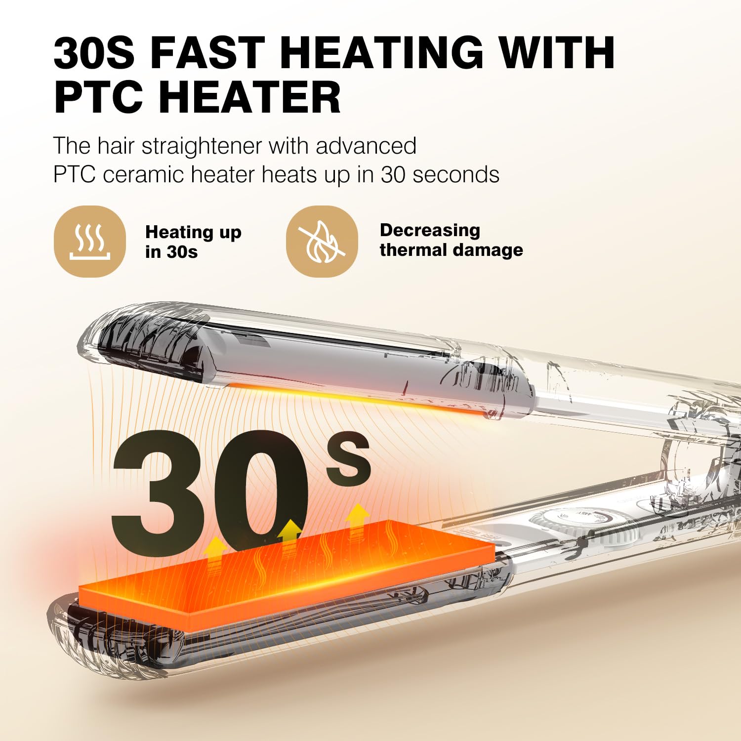 - [PTC CERAMIC HEATING TECHNOLOGY] This flat iron uses advanced PTC heaters that can heat up in 30s, minimizing your wait time. Ceramic technology ensures even heat distribution, providing a stable temperature for faster and more effective straightening.