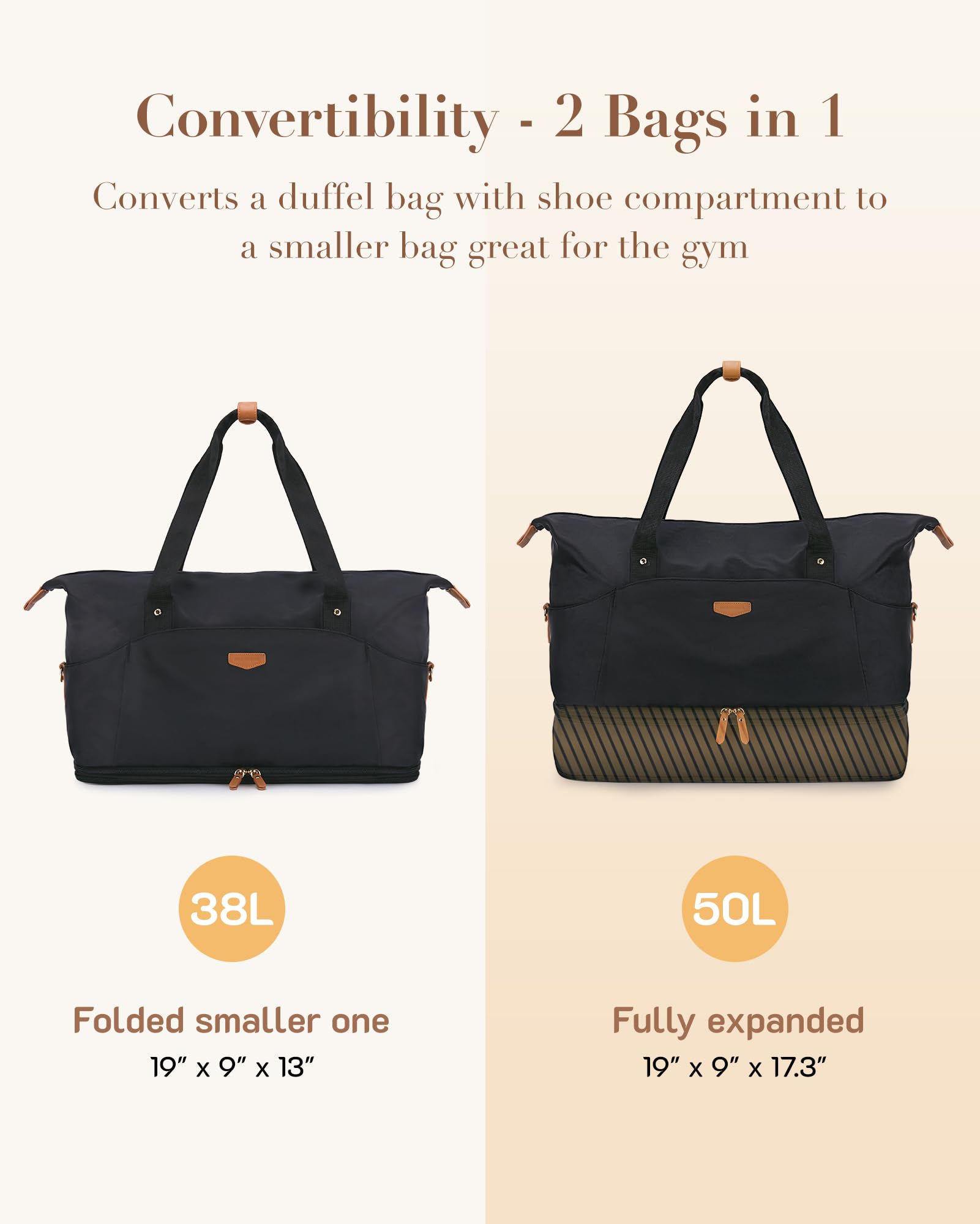 - Expandable, Foldable Bottom Section: The zippered bottom compartment can be folded completely to convert the weekender into a portable smaller bag for excursions, the gym, or shorter trips, or it can be unfolded entirely and used as a shoe compartment,hold 3 pairs shoes