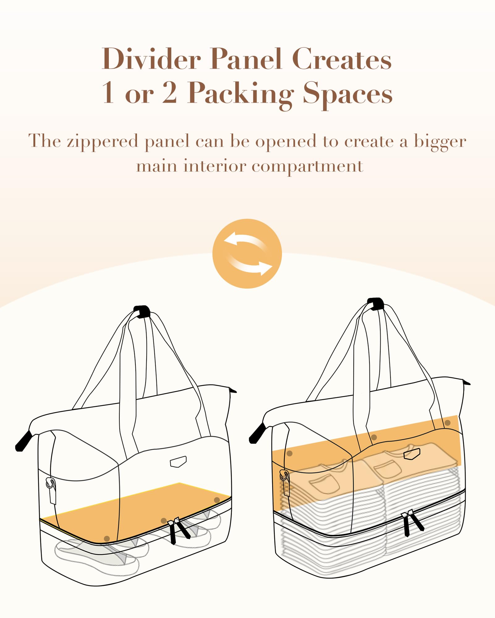 - Divider Panel Creates 1 or 2 Packing Spaces: The zippered divider panel provides separation between the main compartment and the foldable bottom section. Keep it closed to create separate packing areas, or pull it up to create one large packing space