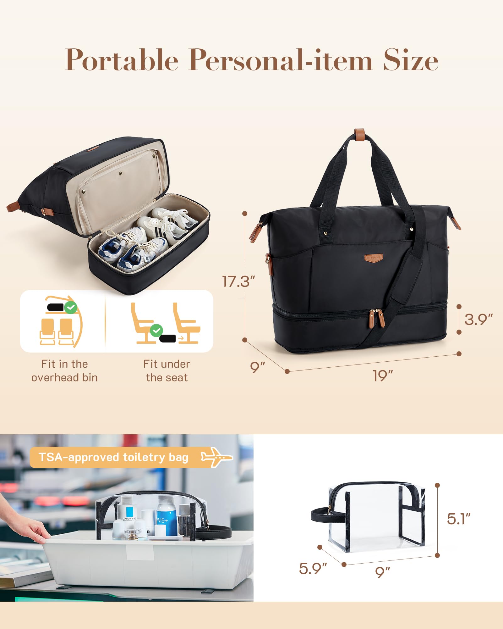 - Durable Construction & Airplane Friendly: The duffel bag is is made with durable and water-resistant nylon, comes with a shoulder strap with foam padding to make it super comfortable to carry. The overnight bag can be a personal item bag for most airplane line. Provides you with a separate TSA toiletry bag that complies with the liquid rules for rapid security check, also as partition storage pocket for your makeup