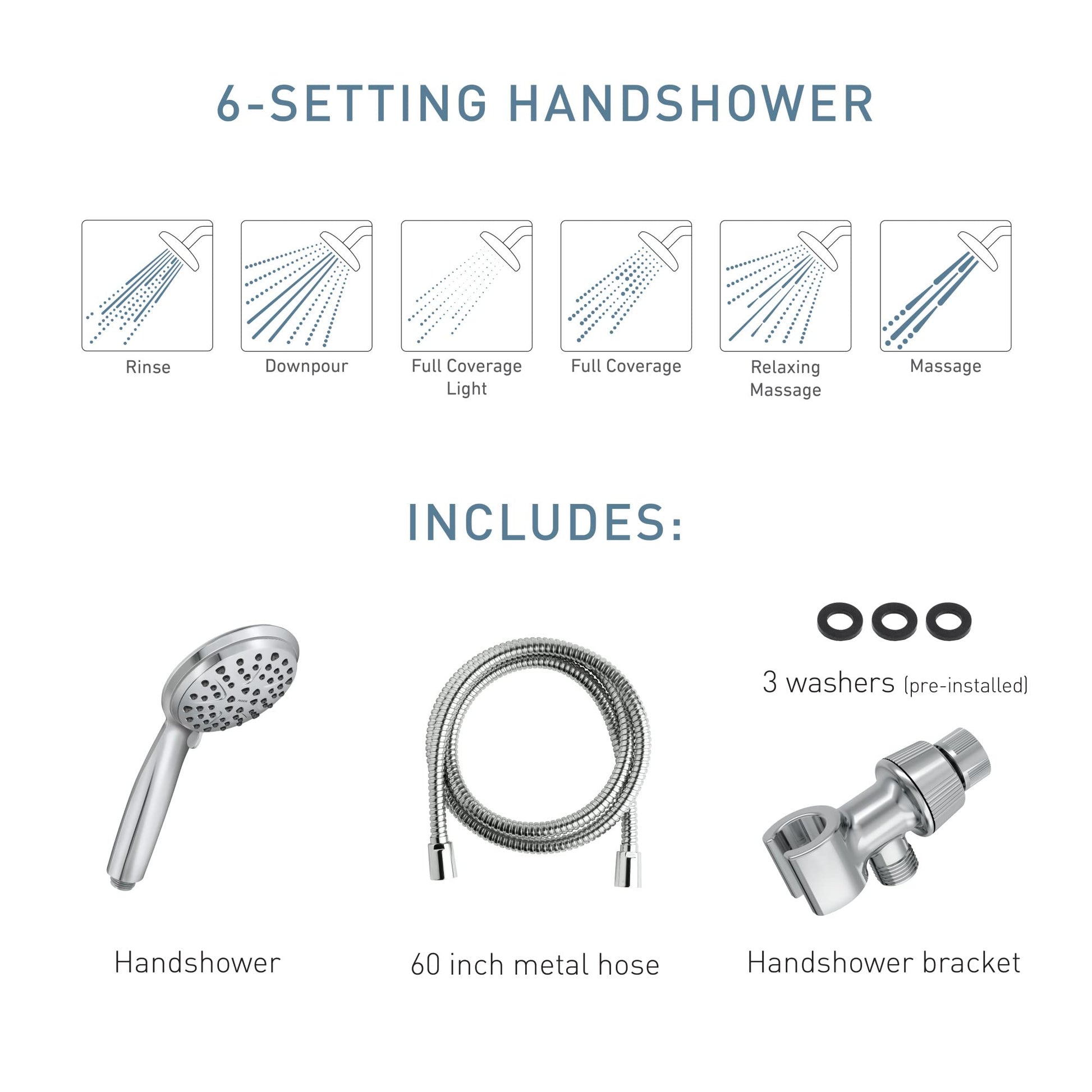 Details: Give your bathroom contemporary style with the Attune hand held shower head. Optimized pressure in each of the 6 settings allows for an excellent showering experience every time. MOEN sets the standard for exceptional beauty and reliable, innovative design. Set includes hand held shower, bracket, and 60in flexible metal hose. From finishes that are guaranteed to last a lifetime, to faucets that perfectly balance your water pressure, Moen sets the standard for exceptional beauty and reliable, innovative design. Bring elegance to your home with premium selections from Moen. From the sophistication of period Traditional to the streamlined refinement of minimalist contemporary, you'll find a host of amazing ways to express your style with products from Moen.