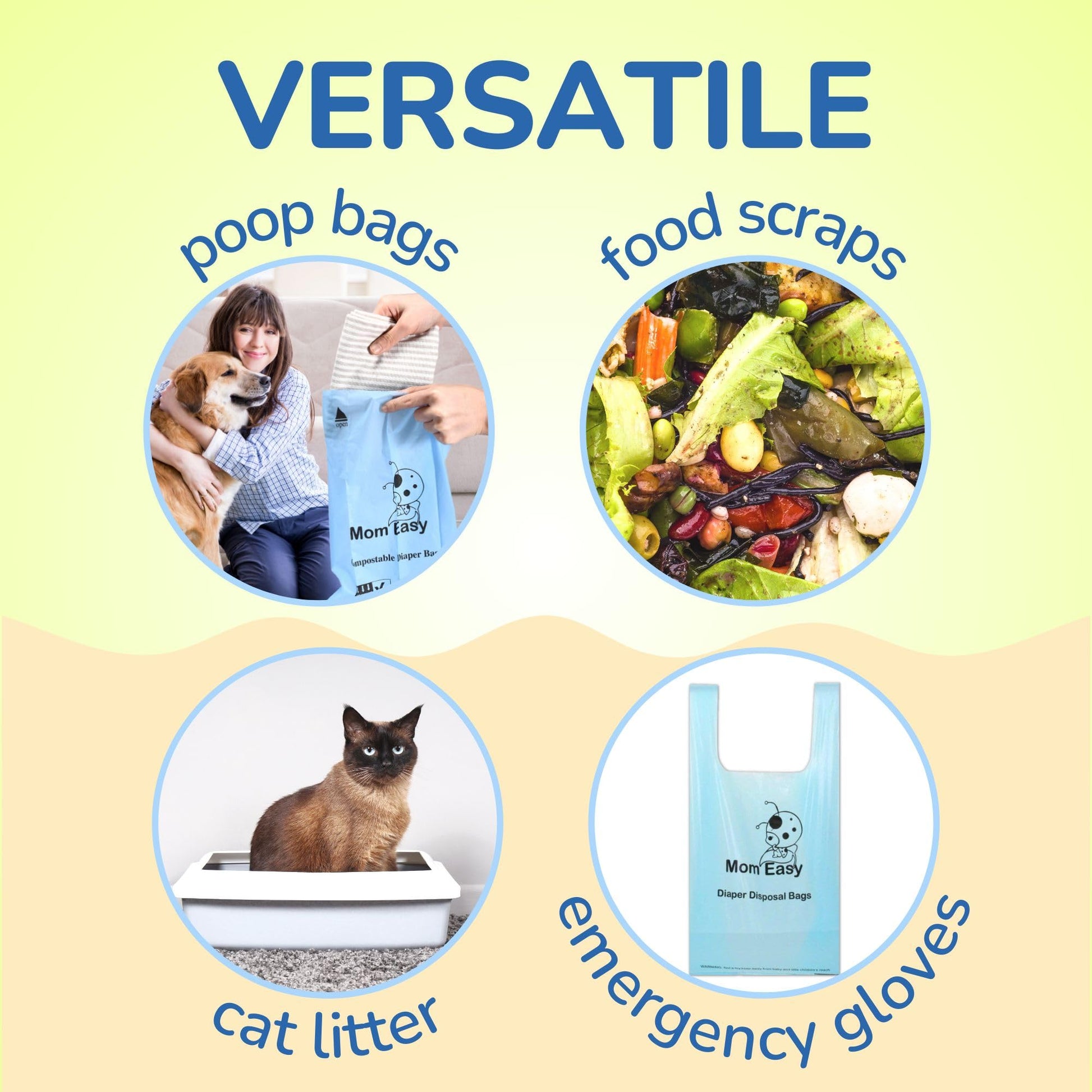 - πΆ WIDELY USED BABY DIAPER SACKS: The dispenser box is easy to access to diaper bags at home, in the car, baby stroller or diaper bags. You also can use these strong baby poop bags for picking up dog poop and scooping cat litter, fruit peels or scraps of food while traveling and in a handful of other instances