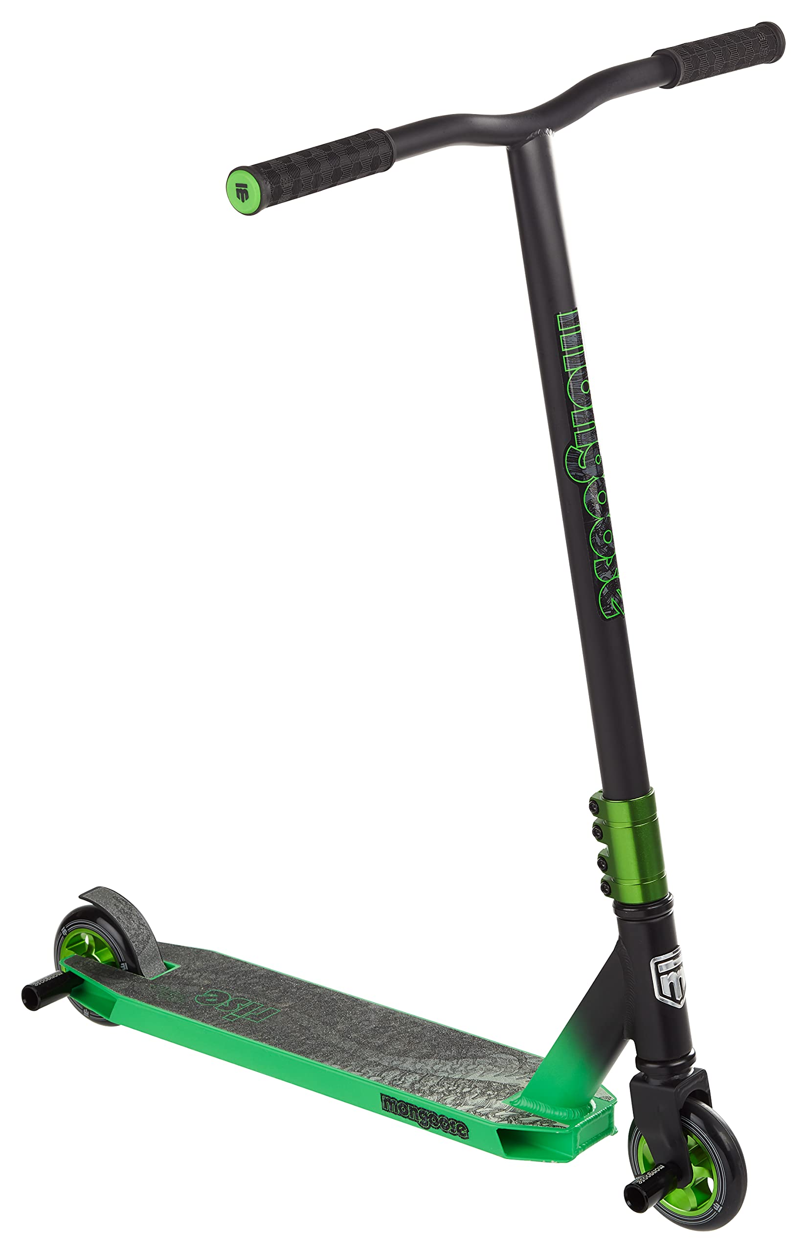Mongoose Rise 100 Pro Freestyle Stunt/Trick Scooter, Lightweight Alloy Deck & Heavy-Duty Frame Up to 220 lbs., T-Bar Handlebar w/ Bike-Style Grip, High Impact 100mm Wheels, Black/Green