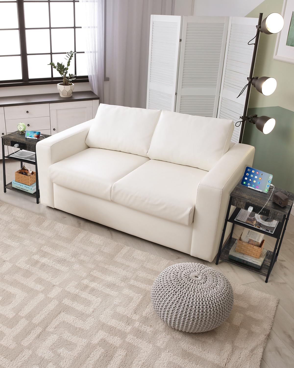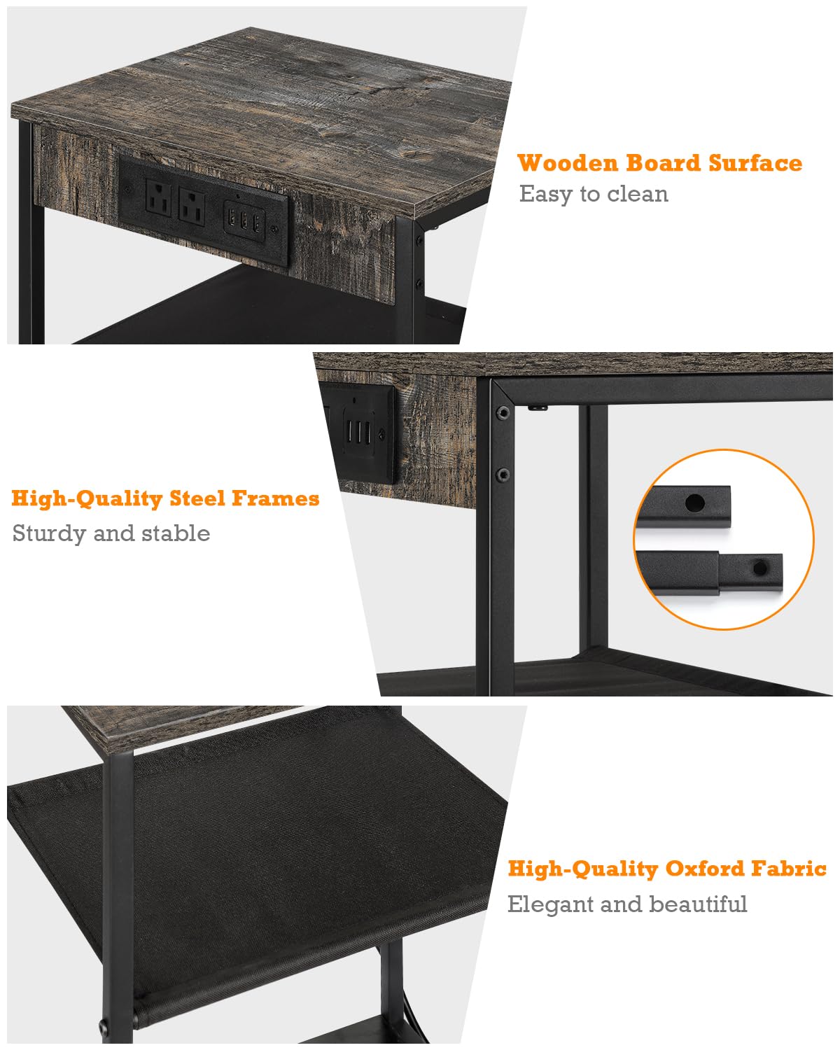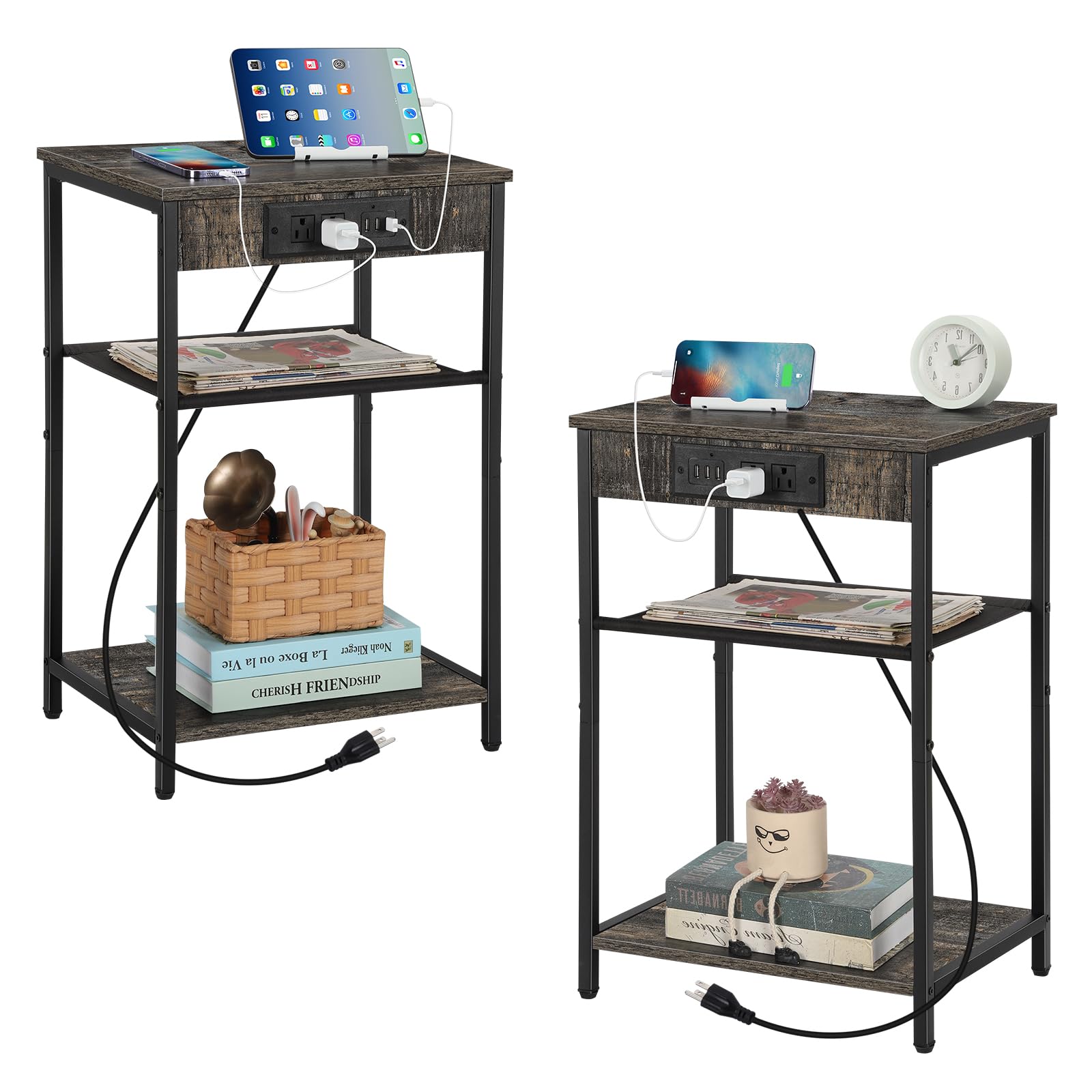 - Power Outlets: This 3-tier end table with 3 USB ports and 2 sockets, integrated design, very convenient to provide a charging place for your mobile phone, Bluetooth headphones, watches, lamps and laptops
