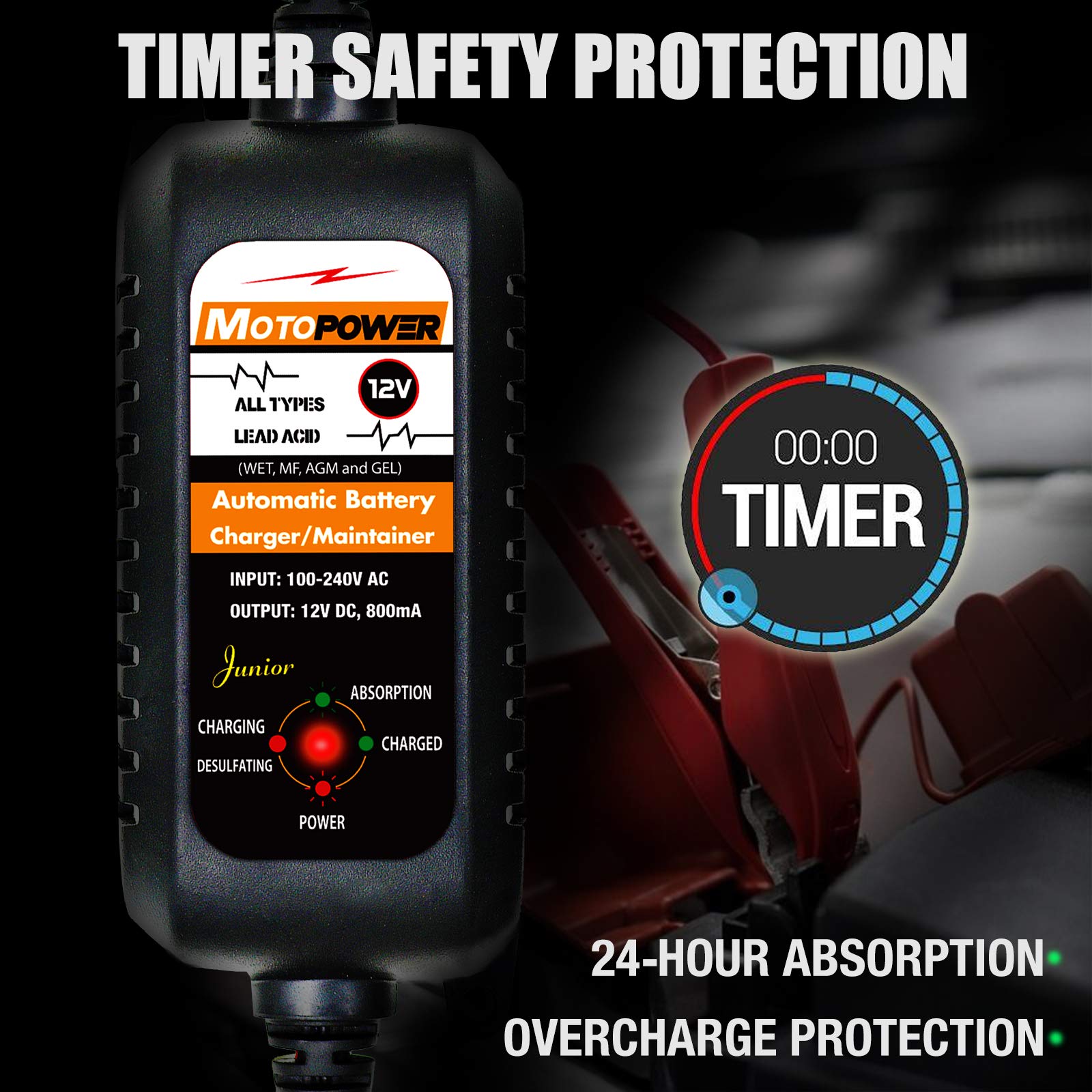 Details: The MOTOPOWER MP00205A 12V 800mA Automatic Batttery Charger/Maintainer can charge all types of 12V lead-acid batteries, including flooded or sealed maintenance free batteries (AGM & gel cell). It's the best smart charger for automotive, motorcycle, marine, RV, Powersport, lawn&garden, children toys, etc.. Input - 100-240V AC Output - 12V DC, 800mA Fully Automatic - No need of any manual operation, just plug and leave it for charging and maintaining your batteries automatically for long time. Micropressor Controlled - The microprocessor controlled program will monitor the whole charging progress and automatically stop output when the battery is fully charged. Then it will monitor the battery voltage and maintain the battery with a float charging current. Safety Protections - Multi-level safety barrier prevents unsafe and abnormal conditions. No worry about overcharge, short circuit and reverse palarity; Spark Free Technology. ECO-Friendly - Zero current draw from the battery and low power consumption. Comply with the highest energy saving standard. Four-Stage Charge - Analysis, Bulk, Absorption and Maintenance. ONE YEAR LIMITED WARRANTY AND 100% SATISFACTION SERVICE - Hassle-free return or refund for any product quality issue. 100% satisfaction service and technical assistance will be provided by contacting our professional customer service team.