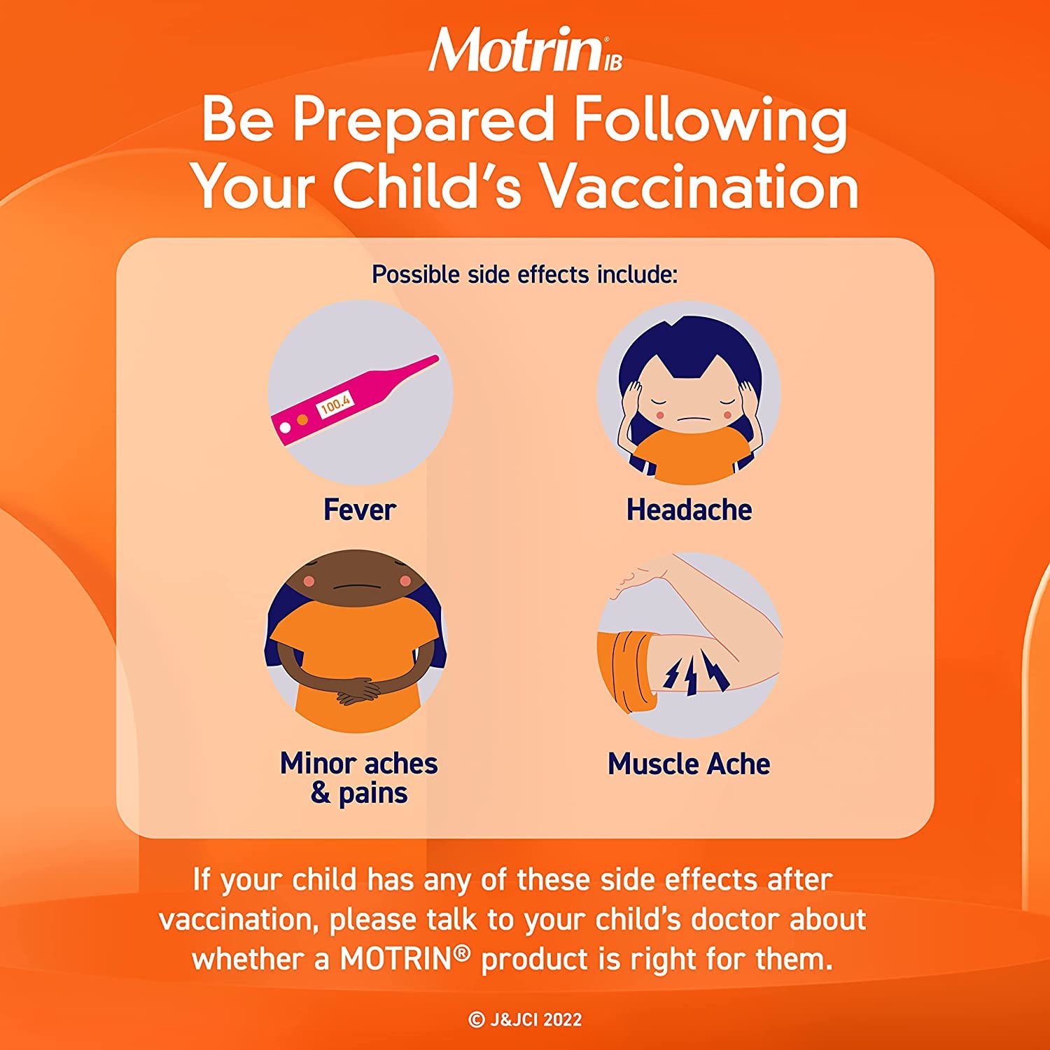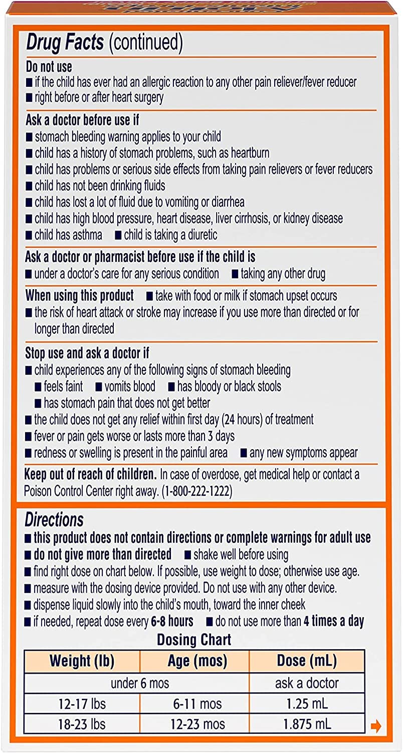 Details: Help your little one feel better with Infants' Motrin Concentrated Drops. Containing 50 milligrams of ibuprofen per 1.25-milliliter dose, these pediatrician-recommended drops provide up to eight hours of relief from minor aches and pains due to the common cold, flu, sore throat, headaches, and toothaches. This berry-flavored formula is for use in infants 6 to 23 months.