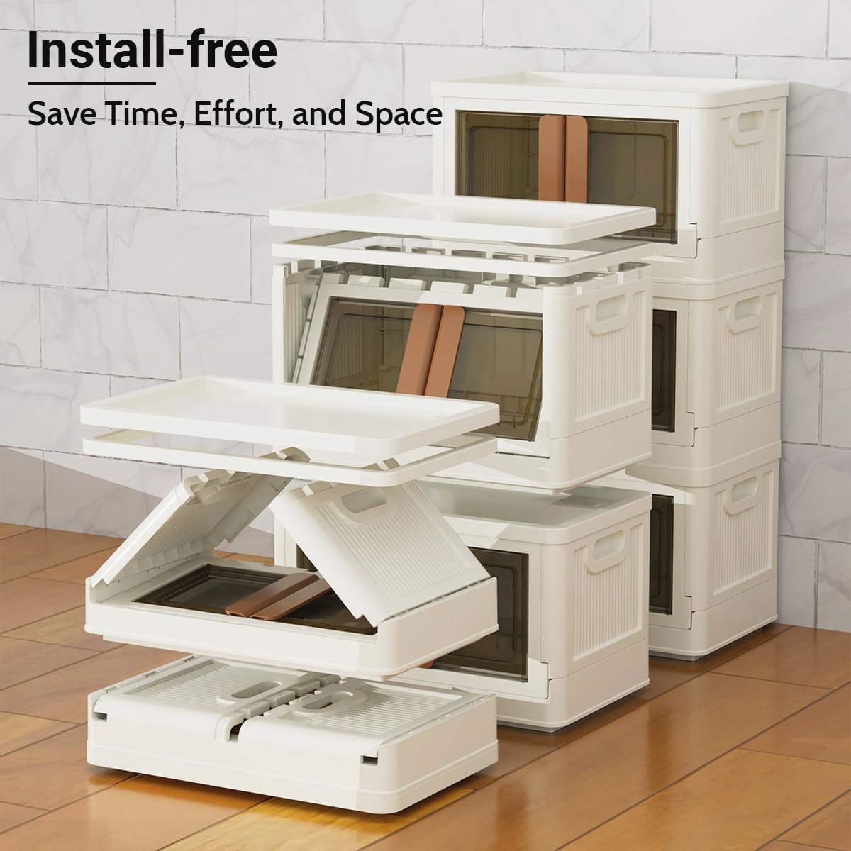 - šćFoldable & Install-Freećcollapsible storage bins with lids adopts an integrated design,allowing you to easily assemble it in the simplest way even without instructions or any tool assistance.When not in use,it can be folded to save more space.