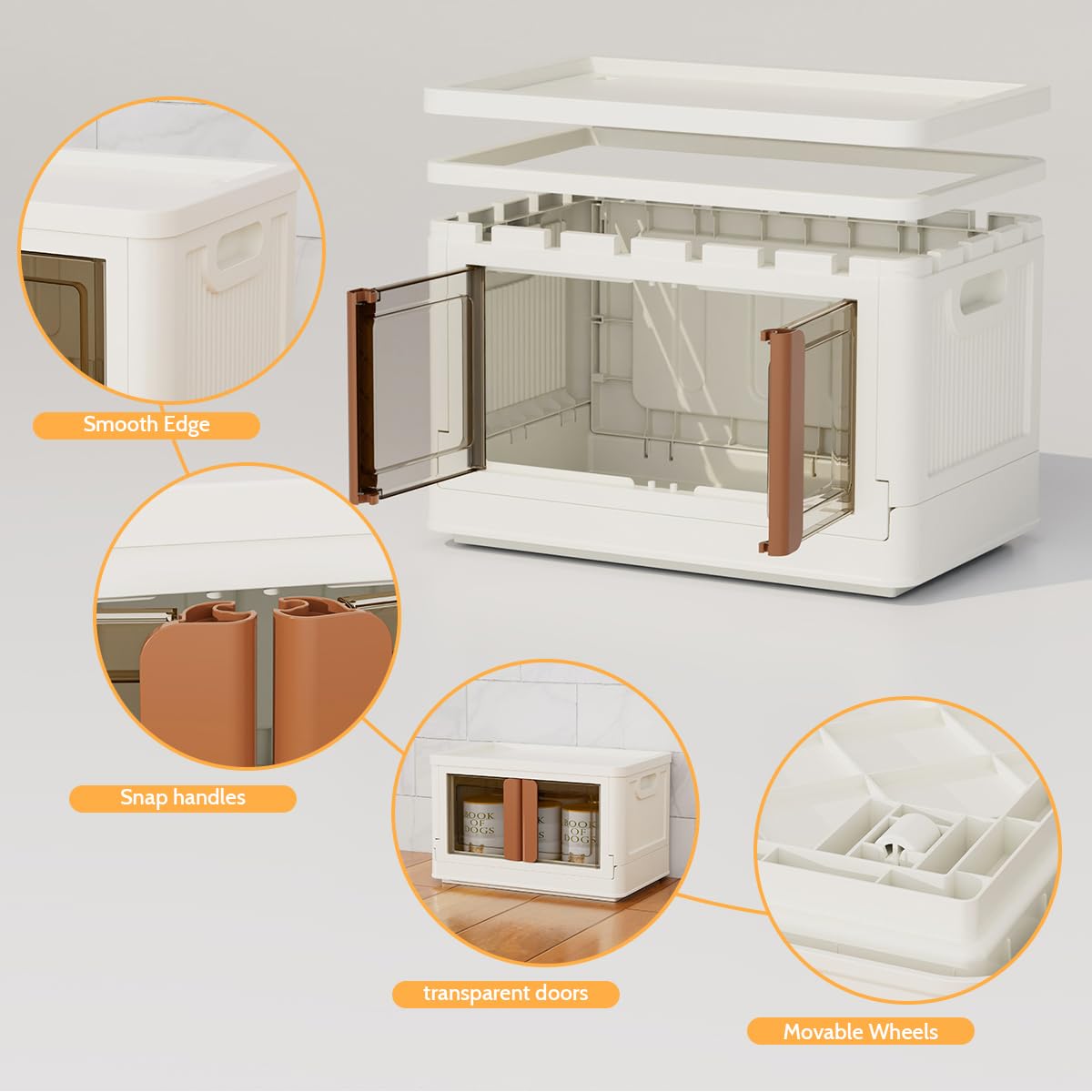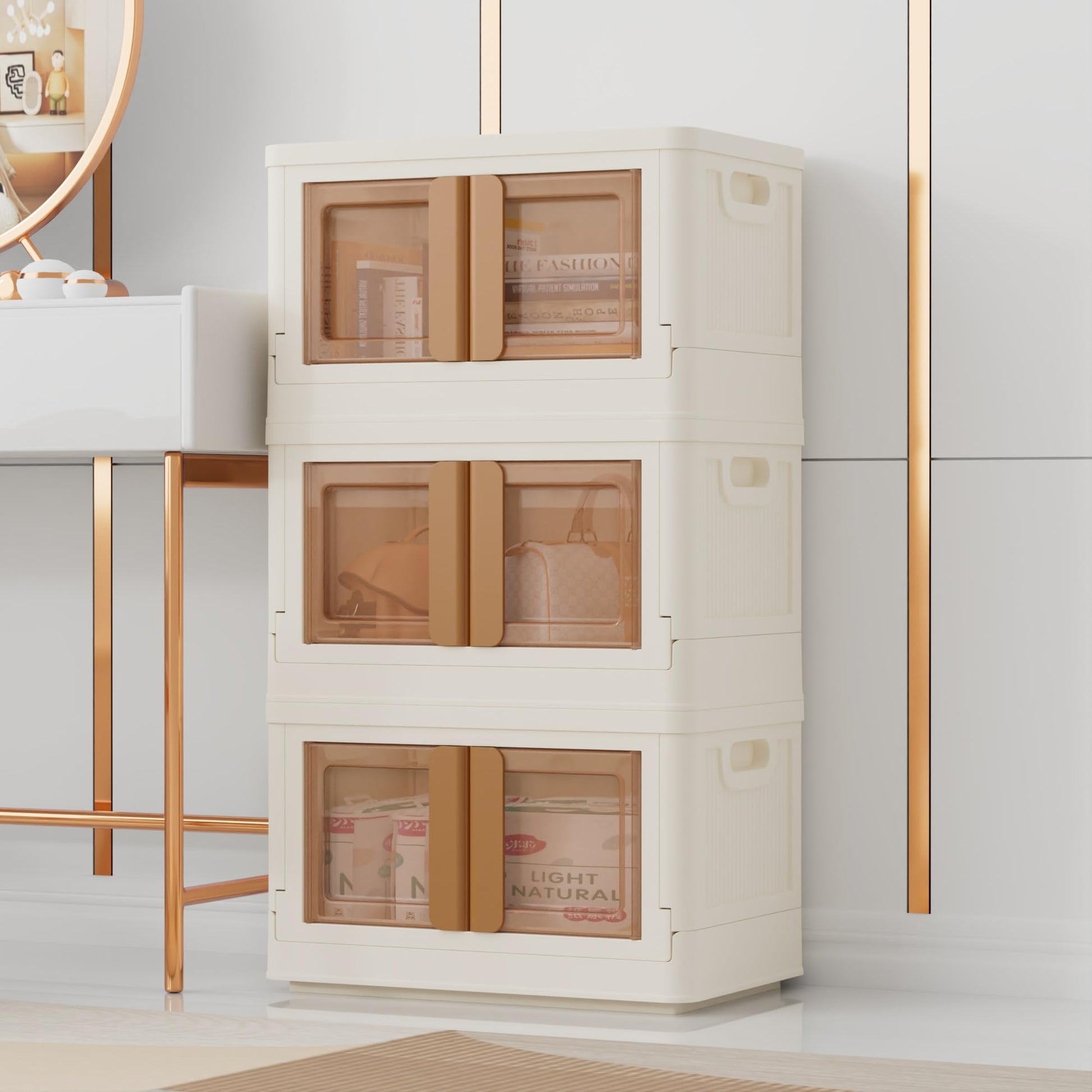 Details: Stackable Storage Bins With Lids and Double Doors, Collapsible Plastic Closet Organizers and Storage 3 Pack 8.5Gal Milk White