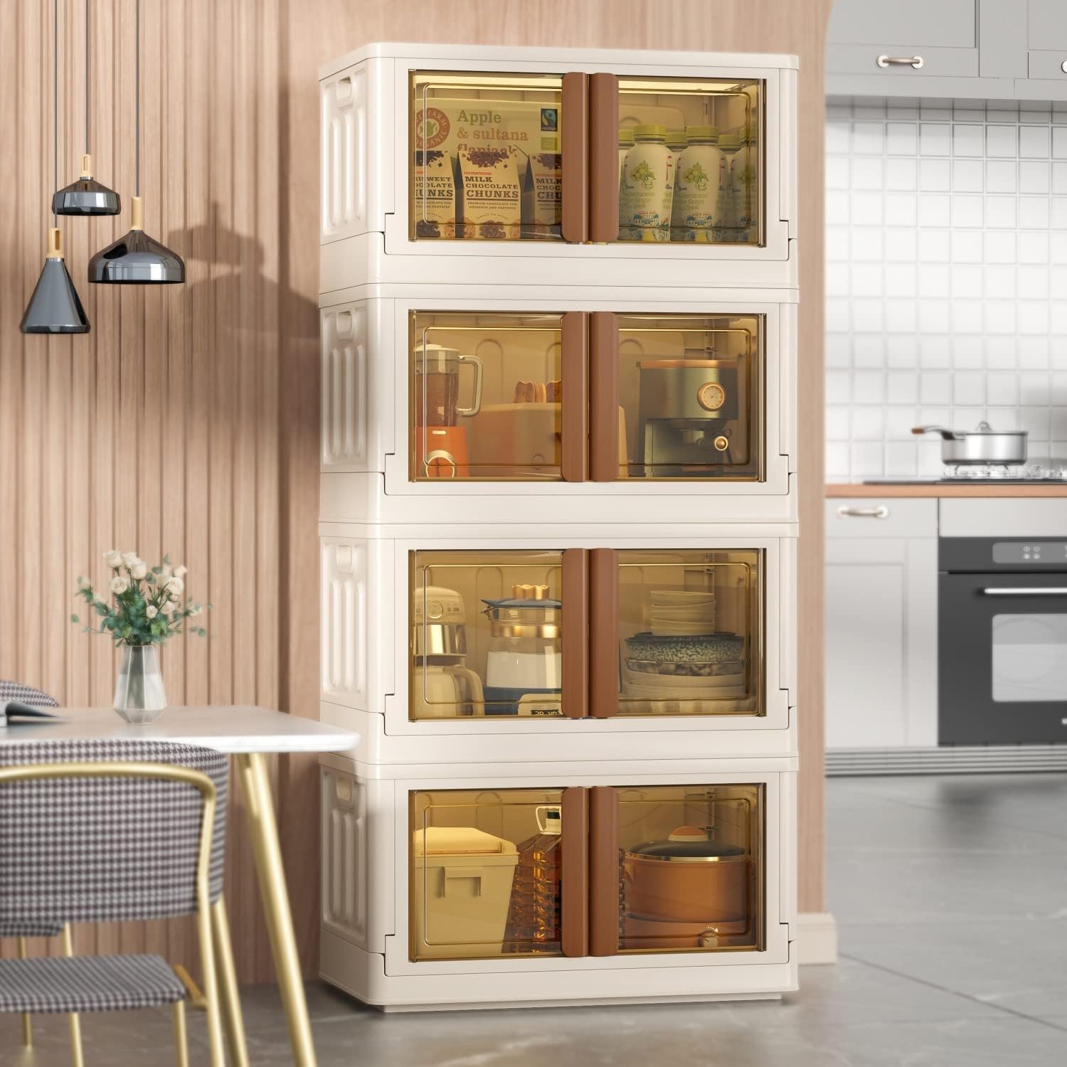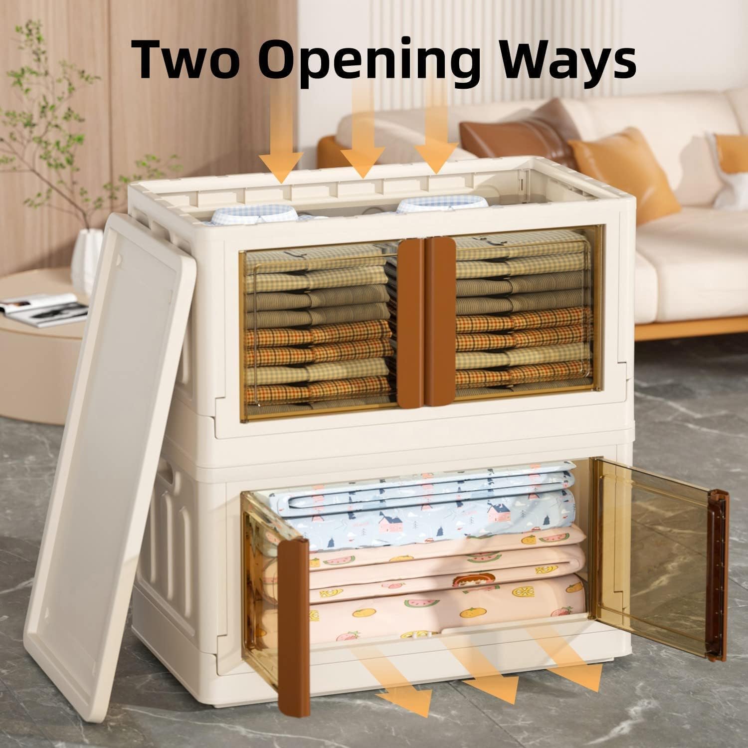 - šćTwo opening waysć These stackable storage bins can be opened from the top cover or the front door, providing easy access to your stored items. The semi-transparent front cover allows for quick identification of contents.