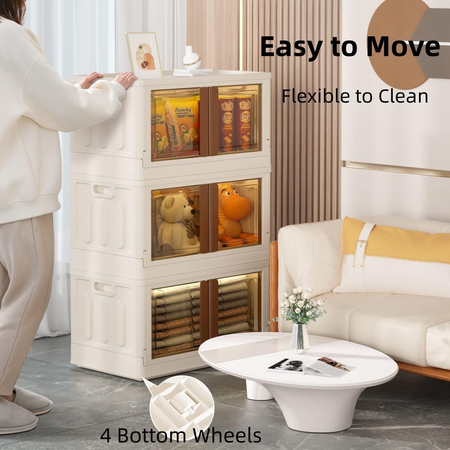 - šćStackable and MovablećThe bottom of the storage bins with wheels is equipped with four movable flexible wheels for easy movement during the cleaning process, and the wheels are also detachable. It is stackable and can tightly stack storage boxes together. There are four grooves on the top cover that fit with the wheels, so there is no need to worry about the storage bins falling off.