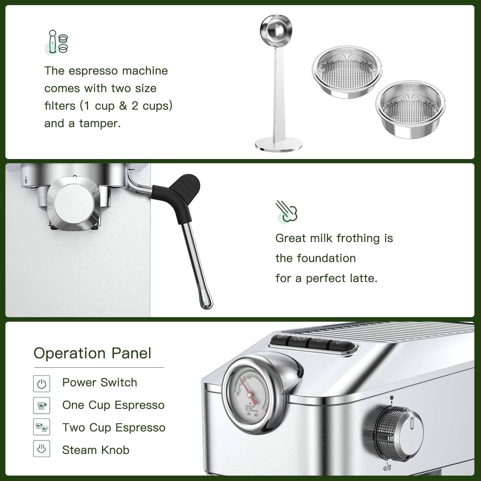 - "【MULTI-ACCESSORIES COMPATIBILITY】: We Have Designed Many Professional Accessories For This Espresso Machine Including Milk Cup*1, Brewing Filter*1, Filter Holder*1, Drip Tray*1, Measuring Spoon*1, Steam Wand*1, Water Tank*1, 4 Indicator. Button Etc."