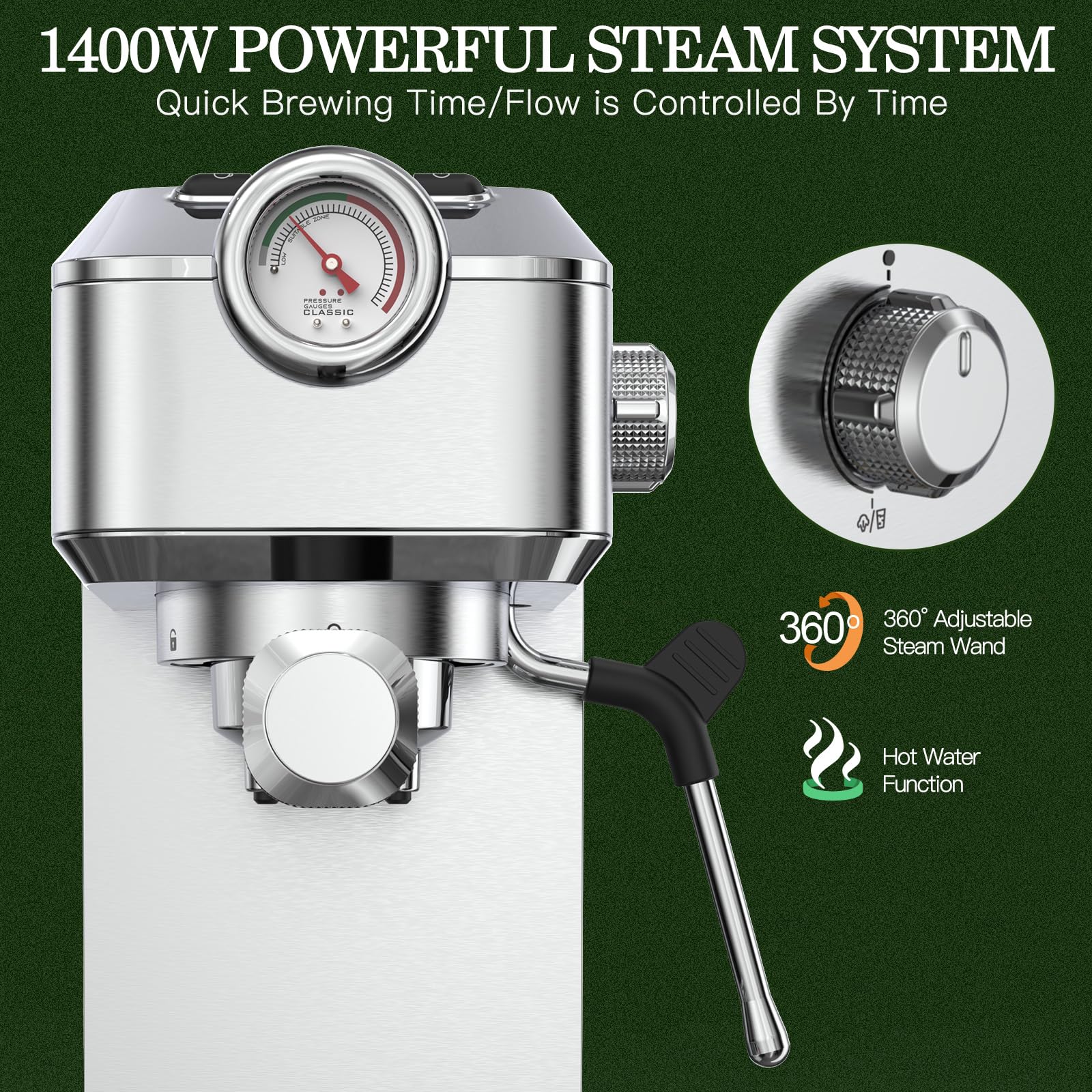 - 【20-BAR HIGH PRESSURE】: MR MIRYE Espresso Machine With A Professional 20 Bar System, 1400w Powerful Motor And Pre-Soak Technology Make Full Coffee Permeation And Extract Rich Crema, Latte. Ensure You Can Get Rich-Tasting Espresso Coffee.