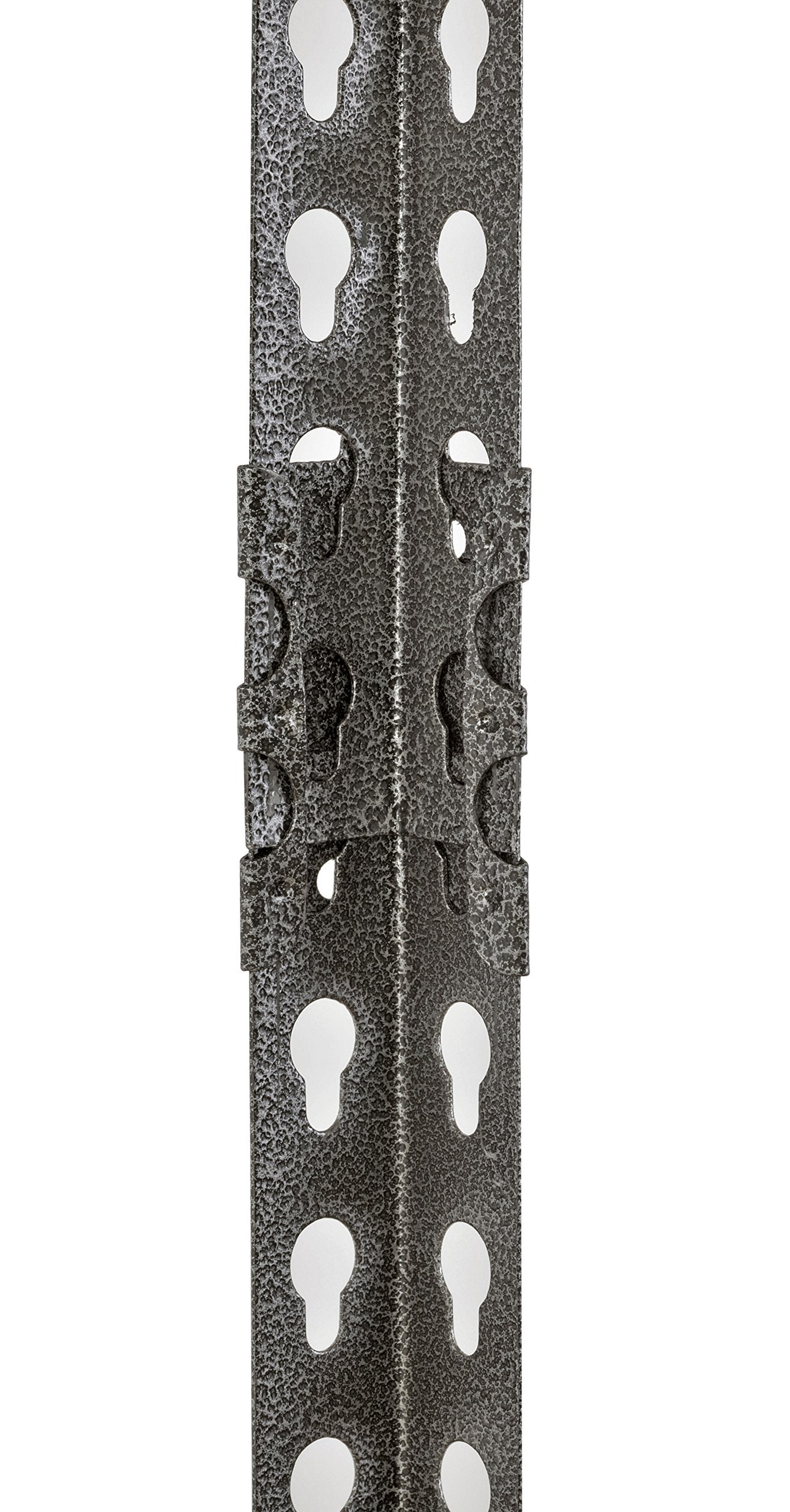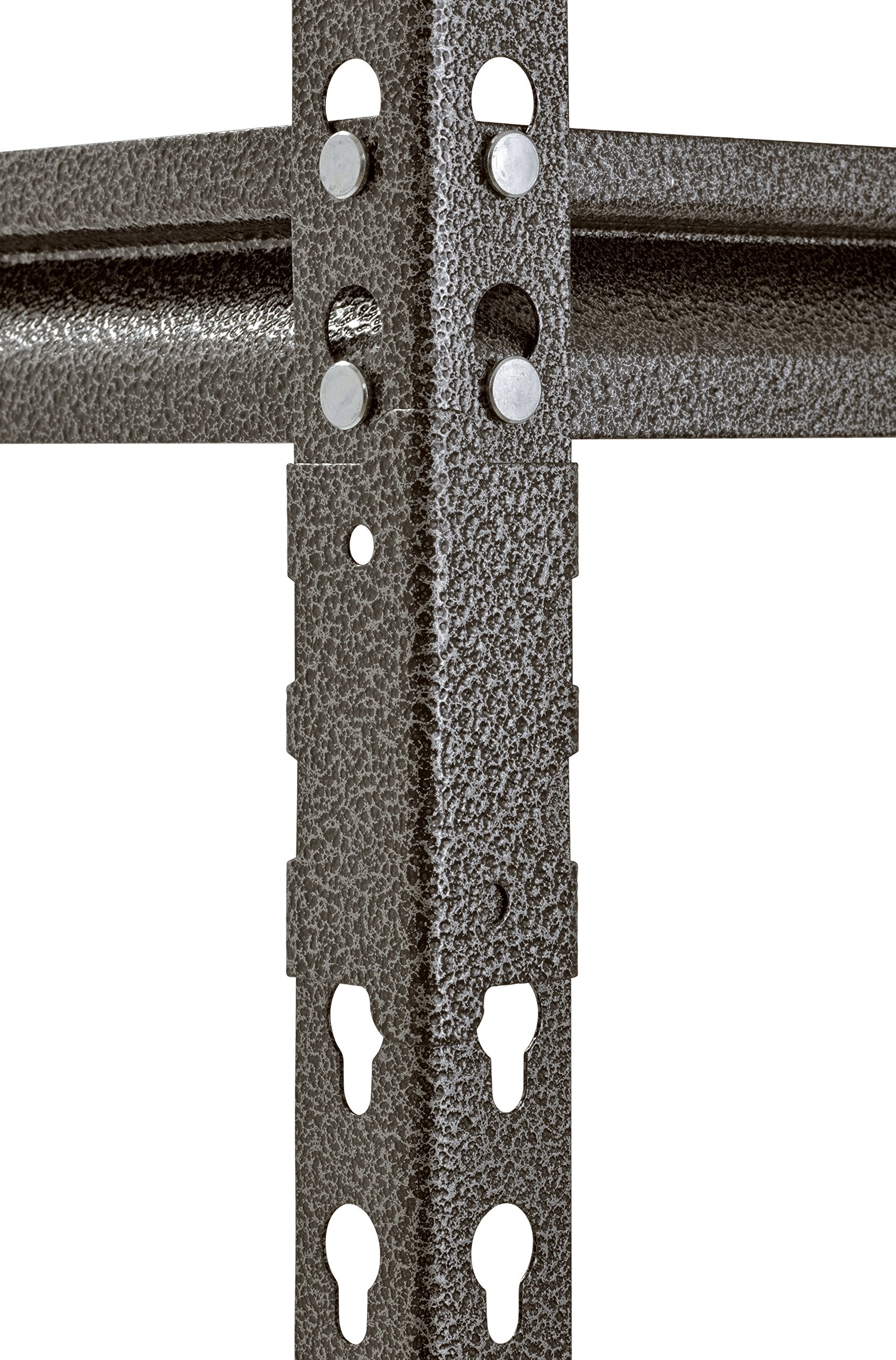 Details: Industrial grade steel construction with durable Silver vein finish. Z‐beam design beams for strength and rigidity. Five shelves with particle board decking can be adjusted in 1‐1/2" increments. Includes a post coupler to make assembly faster and easier, no nuts or bolts. Can be assembled vertically as a shelving unit or horizontally as a Workbench.