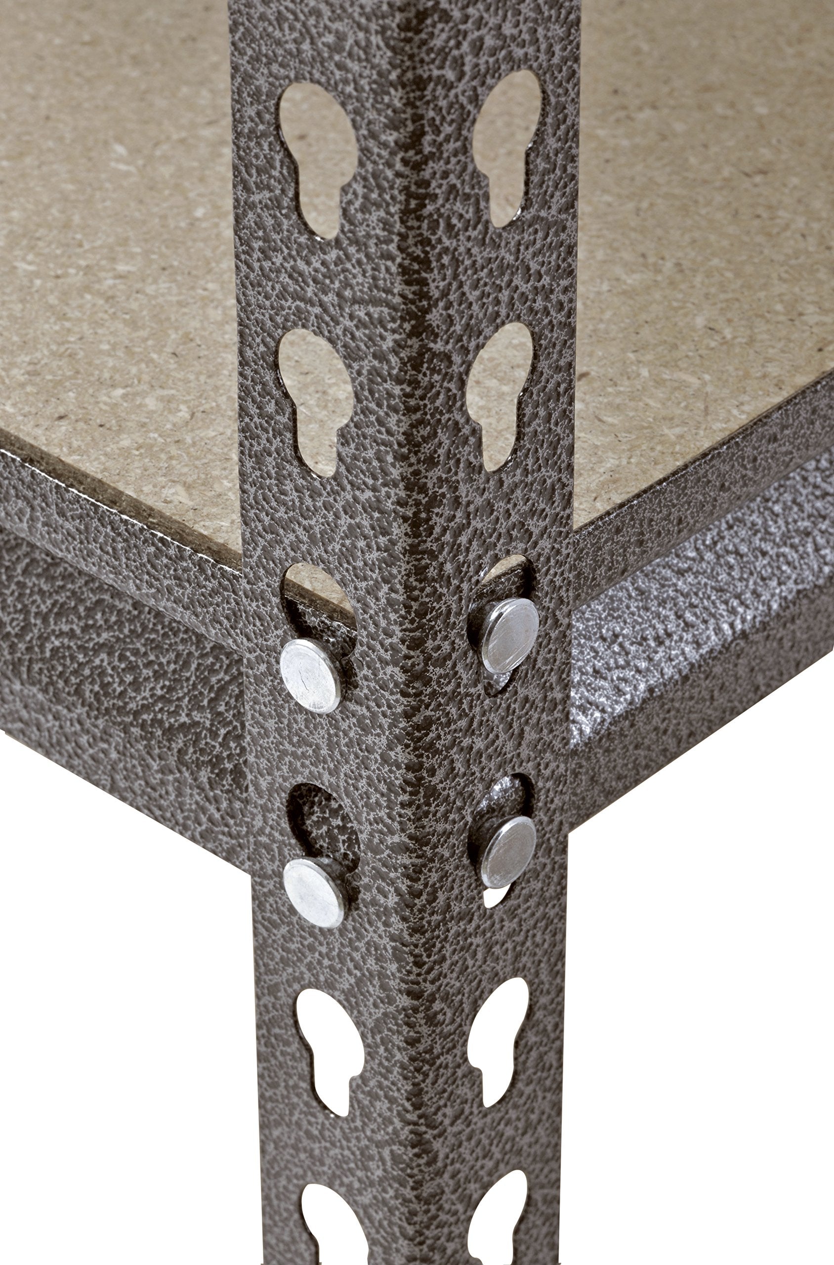 - Shelves are made of particle board supported by double-riveted beams and braces, and adjust in 1-1/2 inch