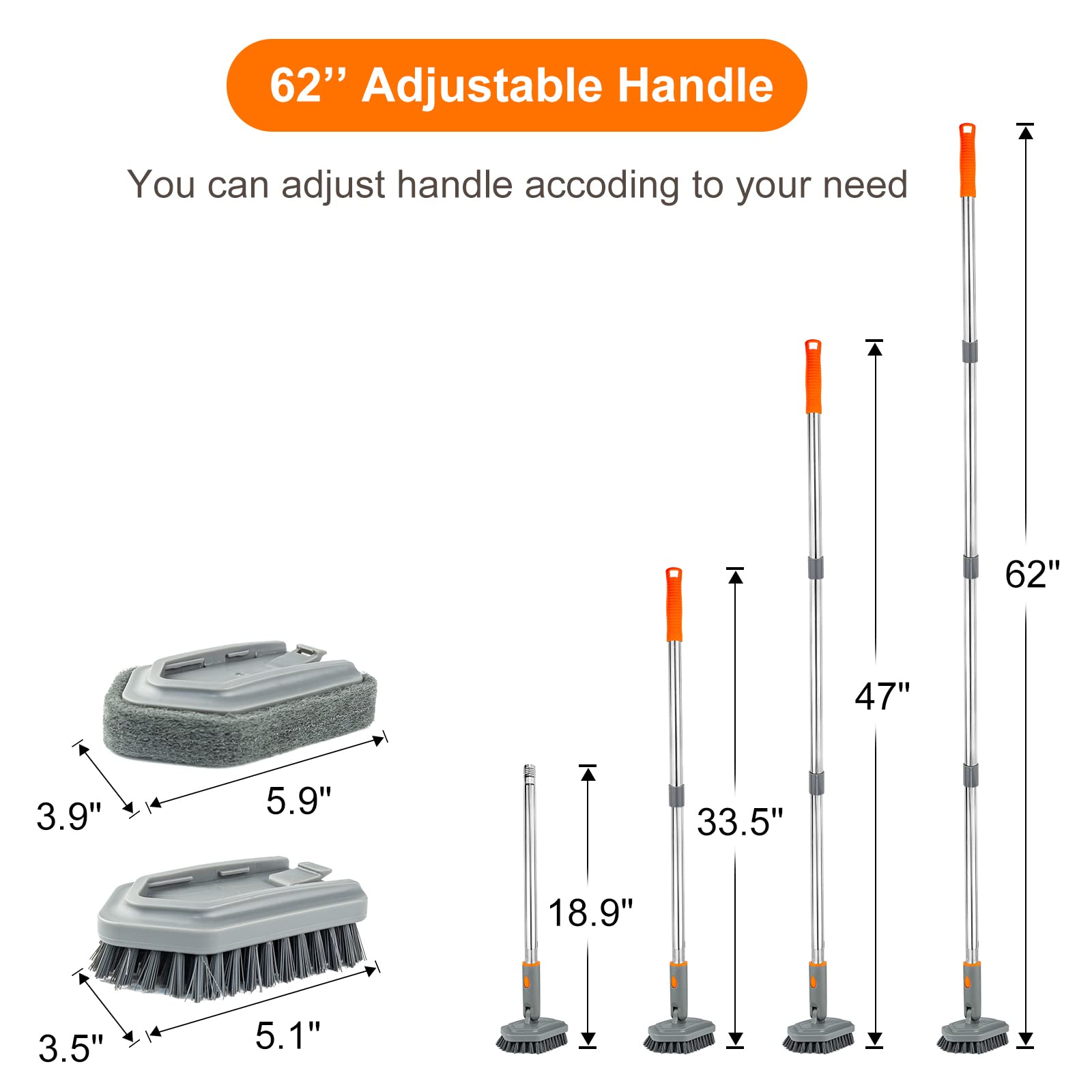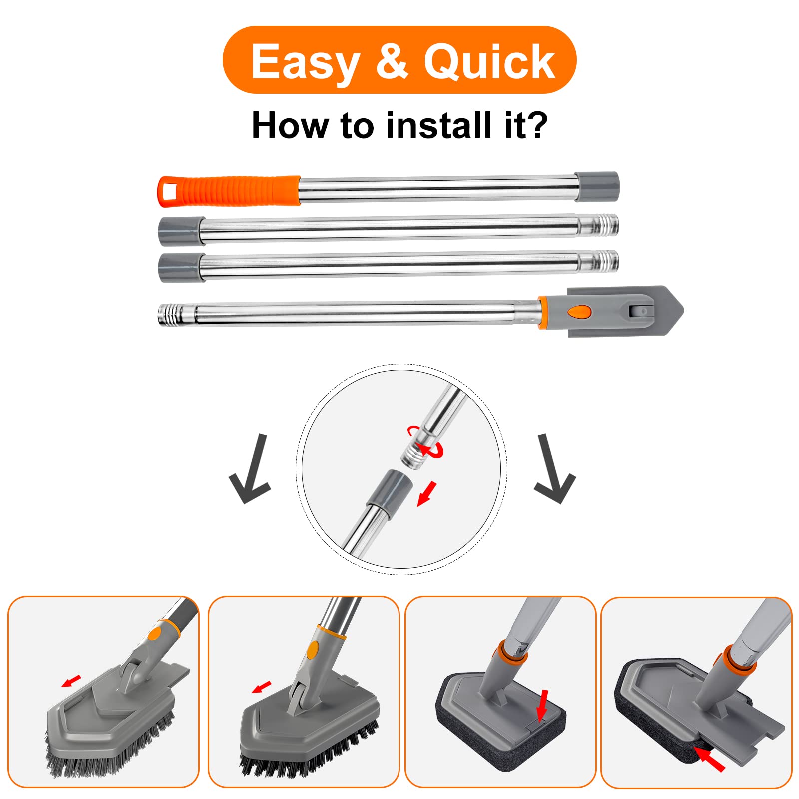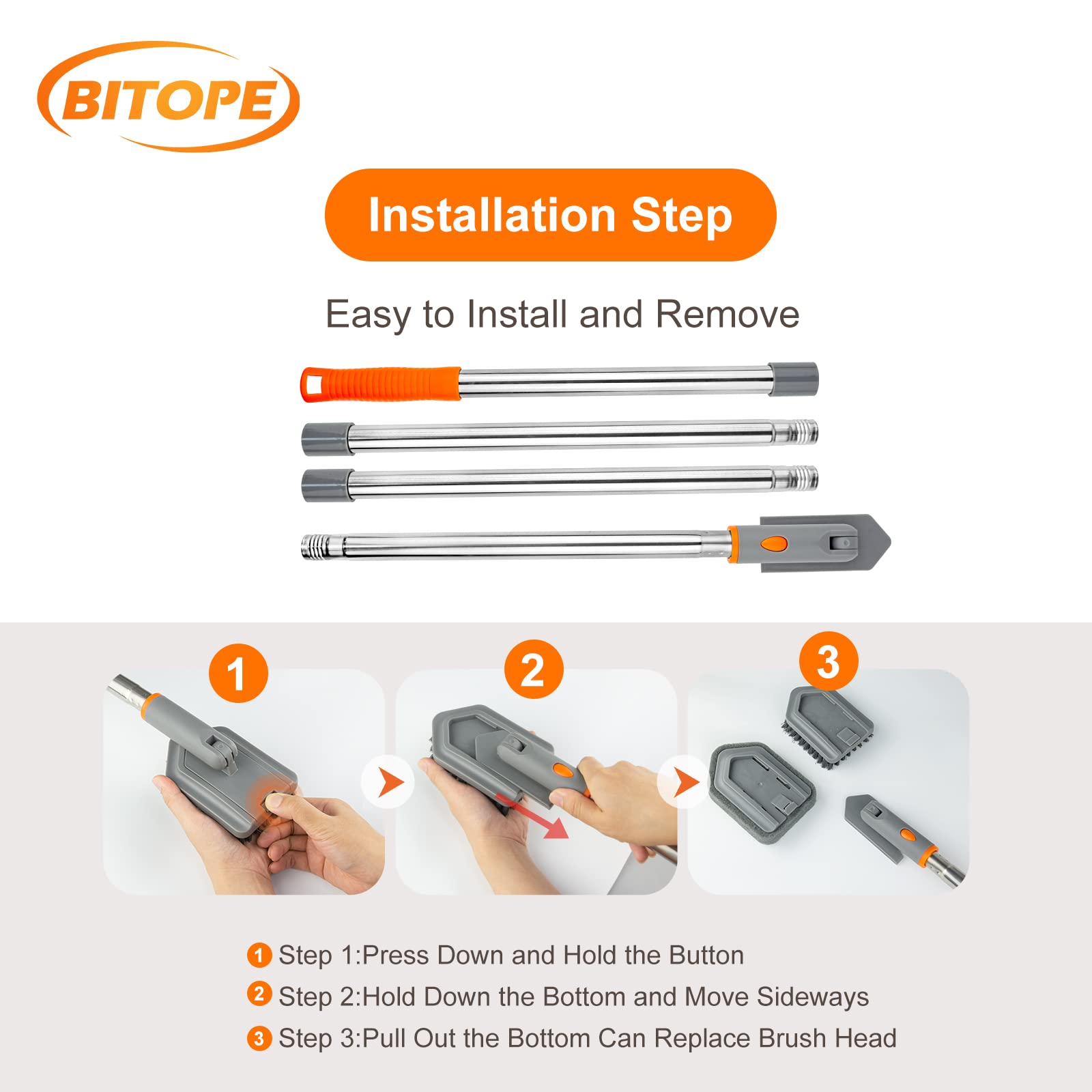 - 【Make Cleaning a Breeze Today】-- if you are not satisfied with BITOPE products, let us know, we will supply 30 days return and 1 year warranty. You will get: 3 x Stainless Steel Poles (with a long telescopic handle), 1 x Stiff Bristle Brush Head, 1 x Sponge Head, 2 x pivot head. If you have any issue with these shower cleaning brush, please contact us.