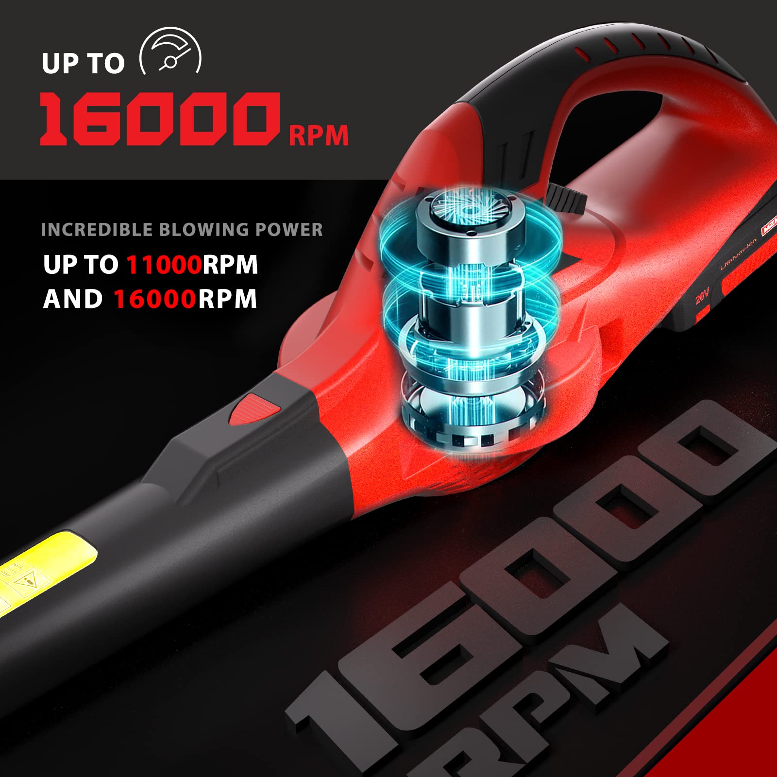 - [ERGONOMIC HANDLE]: The blower is designed to fit the structure of human fingers. The 20v cordless leaf blower is easy and comfortable to hold and can exert force well. The leaf blower cordless with battery and charger is equipped with anti-skid material at the handle in order to better work.