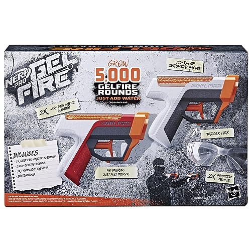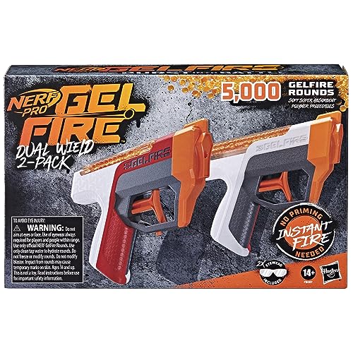Details: Burst into battle with Nerf Pro Gelfire blasters that deliver high-performance blasting and feature hydrated rounds that burst on impact! Nerf Pro Gelfire rounds come dehydrated in the box, add water to hydrate them. The hydrated rounds fire from the blaster at a high velocity and burst when they hit a target. No need to pick up rounds! The Nerf Pro Gelfire Dual Wield Pack includes 2 blasters that feature instant firing, no priming needed! Simply pull the trigger to fire rounds. You can hold and fire a blaster in each hand for a double-fisted battle advantage in competitive outdoor games. Fire as fast as you can pull the trigger! No batteries needed. Each blaster has a 100-round capacity integrated hopper for easy fill and high capacity. Includes 5,000 dehydrated Nerf Pro Gelfire soft super absorbent polymer projectiles, 2 pairs of protective eyewear, and trigger lock. The quality design provides durability for competitive Gelfire games. Outdoor use recommended. For ages 14 and up. Nerf and all related properties are trademarks of Hasbro.